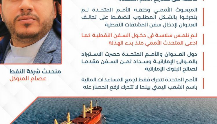 ونوه المتحدث باسم شركة النفط اليمنية بأن الأمم المتحدة تتحرك فقط لجمع المساعدات المالية باسم الشعب اليمني بينما لا تتحرك لرفع الحصار عنه.