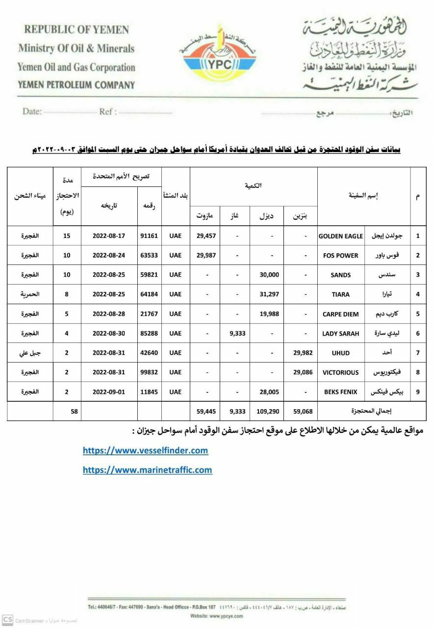 وبحسب البيان فانه لم يتم الإفراج عن أي سفينة وقود خلال فترة التمديد الثانية للهدنة المؤقتة.