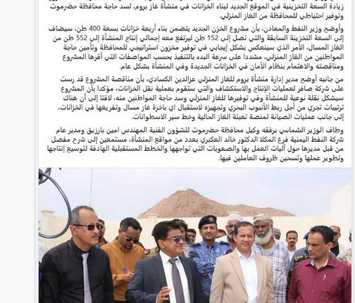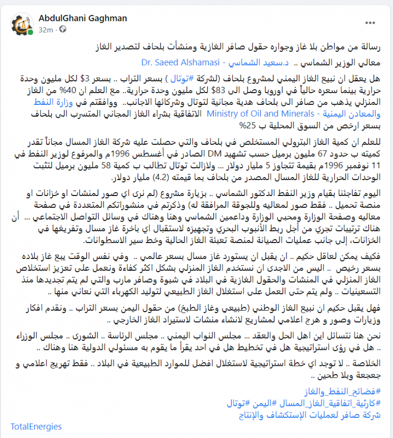 وخاطب قيادة الوزارة التي لا تمتلك أي قرار: ”اليس الأجدى أن نستخدم الغاز المنزلي بشكل أكثر كفاءة ونعمل على تعزيز استخلاص الغاز المنزلي من الحقول الغازية في شبوة وصافر”، مبينا أنها تبيع مليون وحدة حرارية بـ 3 دولار لشركة توتال، في حين يبلغ سعره الحالي في أوروبا 83 دولار.