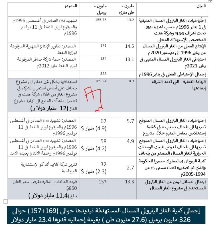 وأشار إلى أن تشهيد DM الصادر في أغسطس 1996م، قدر الكمية التي تحصل عليها “توتال” بـ 67 مليون برميل، بقيمة تتجاوز 5 مليار دولار، مبينا أن توتال لا تزال تطالب بكمية 58 مليون برميل لتثبت الوحدات الحرارية للغاز المسال المصدر من بلحاف الذي يبلغ قيمته أكثر من 4.2 مليار دولار.