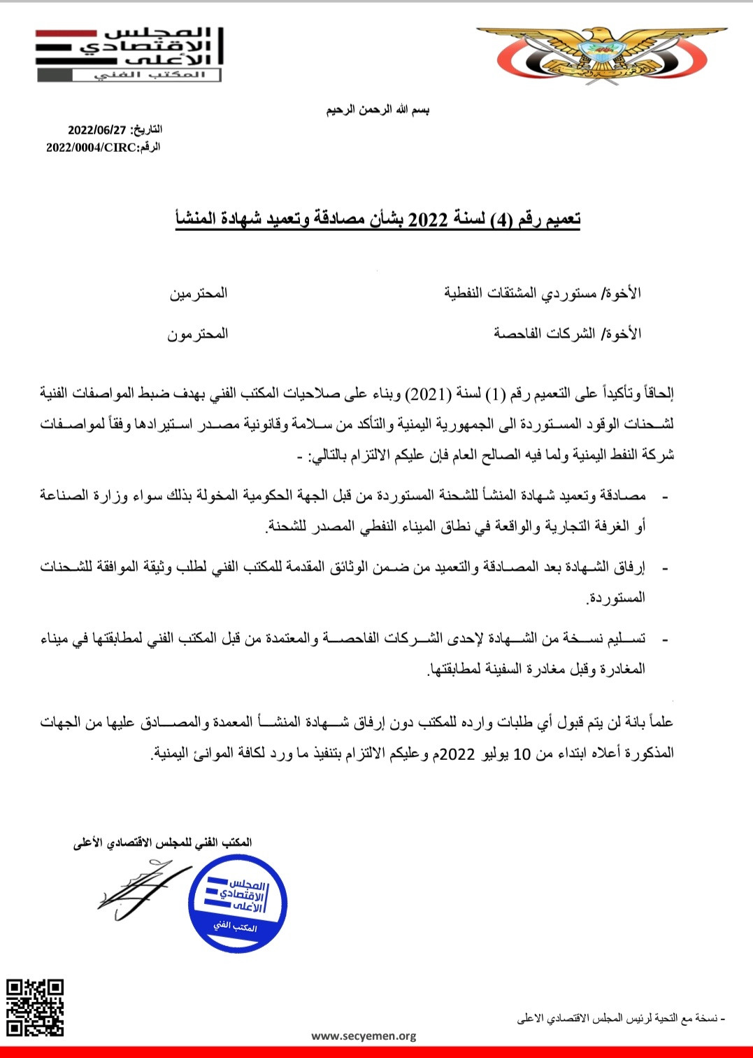 وتتضمن الوثيقة الصادرة عما يسمى “المجلس الاقتصادي الأعلى” التابع لسلطة مرتزقة العدوان وتعود إلى شهر يونيو الماضي أي بعد الهدنة، إلزام المستوردين بالتعامل مع شركة محددة لفحص “المواصفات الفنية لشحنات الوقود المستوردة”، كما تطلب إرفاق العديد من وثائق الموافقة من جانب سلطات المرتزقة.