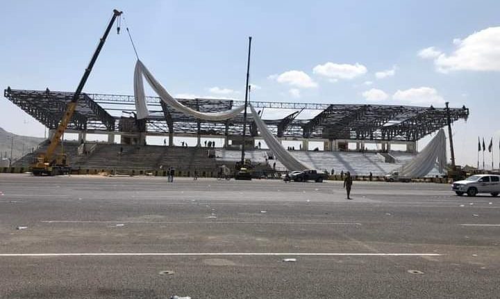 تجري الأعمال الإنشائية على قدم وساق لإستكمال ترميم منصة الاحتفالات في ميدان السبعين بالعاصمة صنعاء والتي سبق ان استهدفها طيران تحالف العدوان السعودي الأمريكي بعدة غارات ما أدى إلى تدميرها بالكامل.