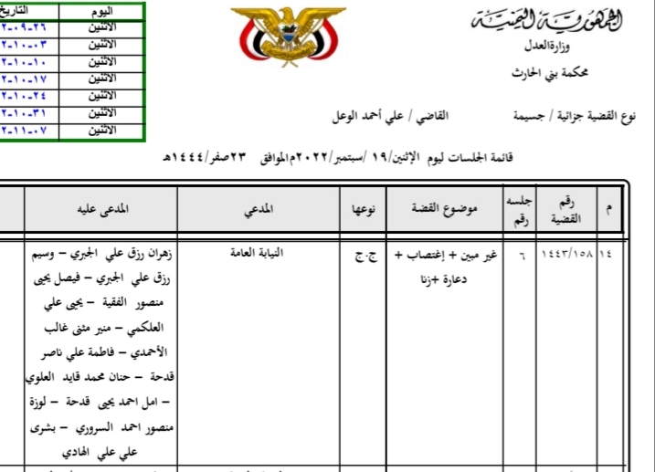 حددت محكمة بني الحارث الإبتدائية بأمانة العاصمة اليوم الإثنين موعد جلسة محاكمة المتهمين في واقعة اغتصاب ثلاث شقيقات قاصرات في صنعاء.