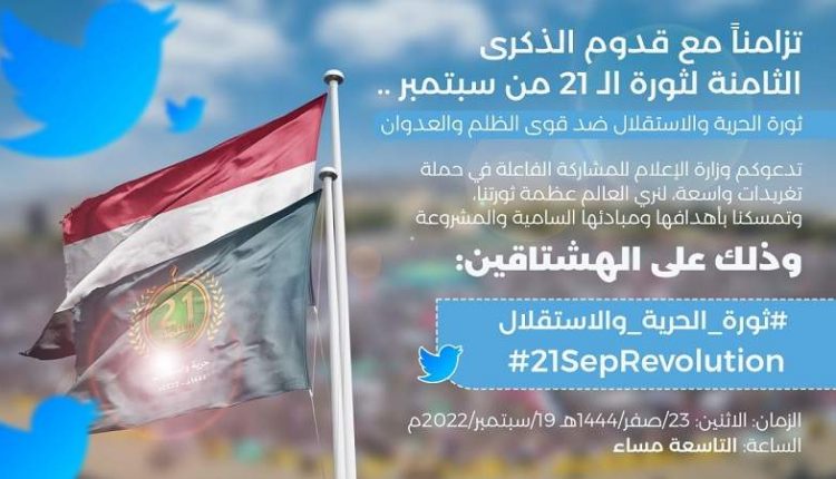 تطلق وزارة الإعلام، مساء اليوم الاثنين، حملة تغريدات واسعة لإبراز إنجازات ثورة الـ21 من سبتمبر وتعريف العالم بمبادئها العظيمة.