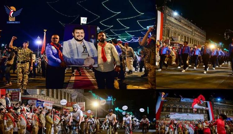 ورفع شباب الكشافة ونجوم المنتخبات الرياضية علم الجمهورية اليمنية وصور قائد الثورة السيد عبدالملك بدر الدين الحوثي، والشعارات المعبرة عن الفرحة بقدوم هذه المناسبة الوطنية التي مثلت عنواناً للتخلص من قوى الهيمنة والوصاية وتصويب المسار الوطني.