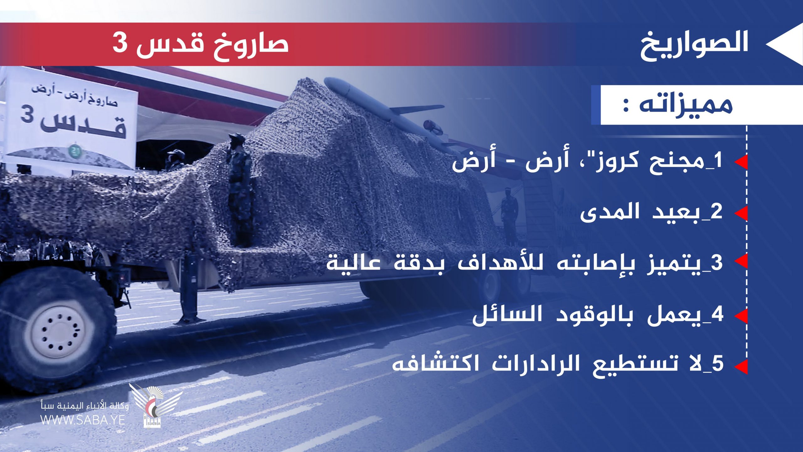 وأما صاروخ “قدس3” يتميز بقدرته على التخفي عن الالتقاط الراداري، وقدرته على الوصول إلى أهداف بعيدة المدى وإصابتها بشكل دقيق ومباشر ويصل مداه إلى أبعد نقطة في كيان العدو الصهيوني، وهذا النوع من الصواريخ الذي يعمل بالمحركات النفاثة تحدث عنه خبراء في جيش العدو الإسرائيلي كسلاح كاسر للتوازن، وهو مخصص لحماية مدينة القدس المحتلة كما تقول صنعاء.