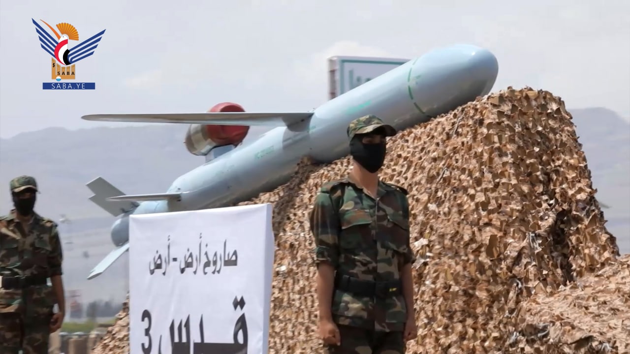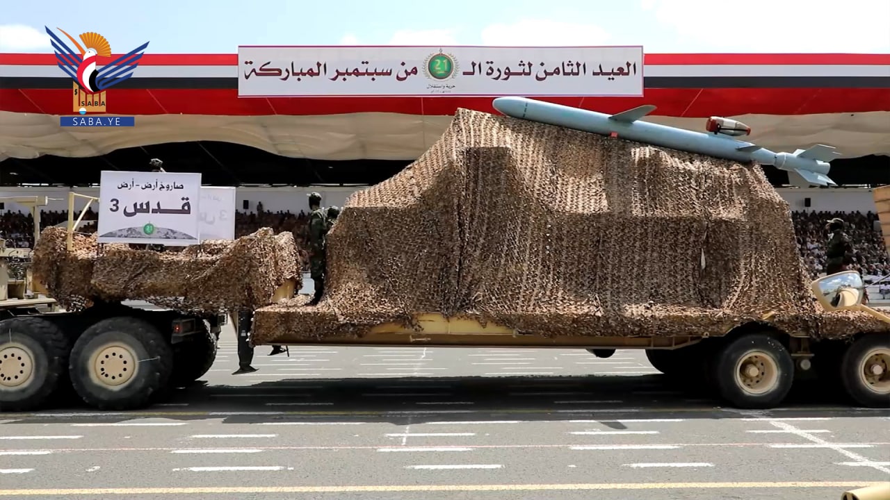 واستعرضت القوات المسلحة خلال العرض العسكري صواريخ “قدس” المجنحة بأجيالها الثلاثة وهي صواريخ من إنتاج الصناعات العسكرية اليمنية المحلية ويصل مداها إلى كل مناطق وعواصم دول تحالف العدوان، ولا تستطيع الرادارات كشفها.