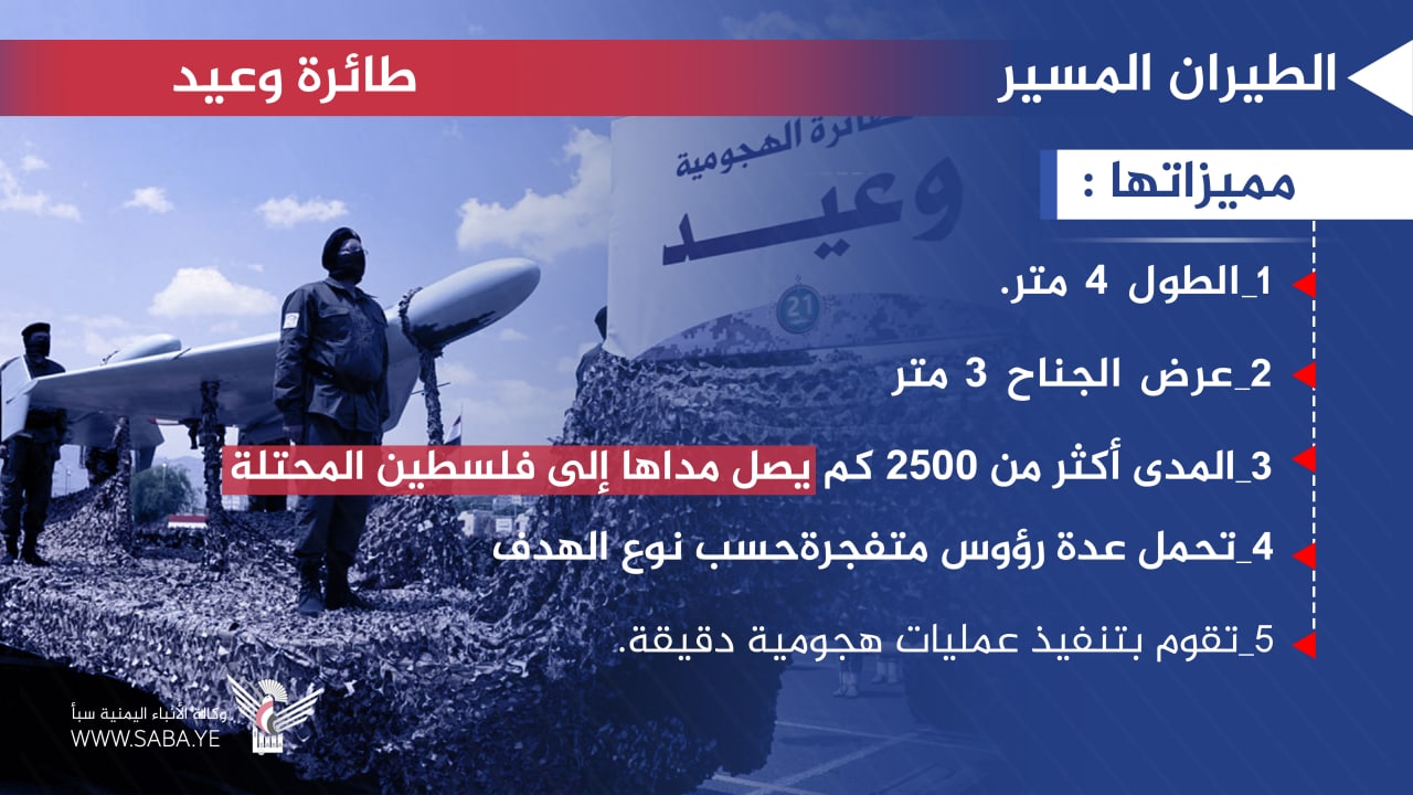 وأيضاً، ضم العرض العسكري الأضخم والأكبر للقوات المسلحة اليمنية والذي يُعد الأول من نوعه والأكبر في المنطقة، منظومات عديدة لأجيال متعددة من الطائرات المسيرة ومنها طائرة “وعيد” بعيدة المدى التي يصل مداها إلى أكثر من 3000 كم، وهي قادرة على الوصول إلى الأراضي الفلسطينية المحتلة.