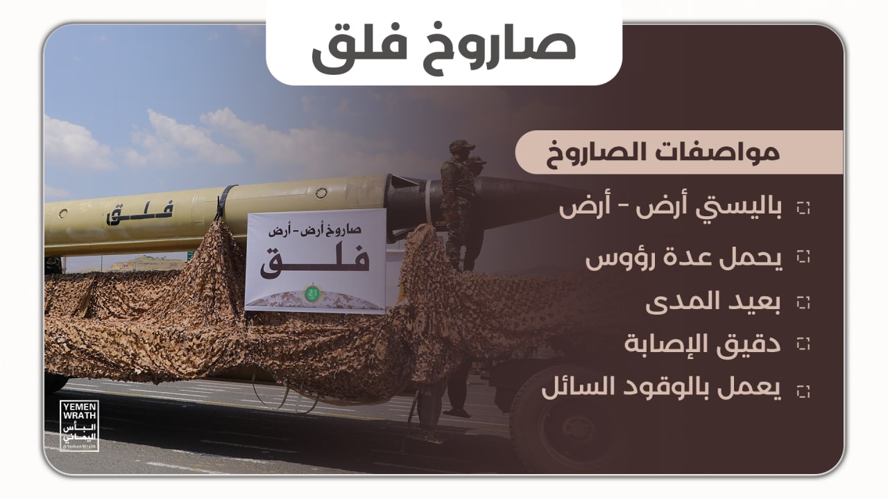 وصاروخ “فلق” بعيد المدى، وهو صاروخ باليستي أرض – أرض يحمل عدة رؤس ودقيق الإصابة، كشفت عنه القوات المسلحة اليمنية لأول مرة في العرض العسكري وهو صاروخ جديد تم تجربته مؤخراً على أهداف بعيدة، وسيكون له دور حاسم في الحرب والمعركة القادمة.