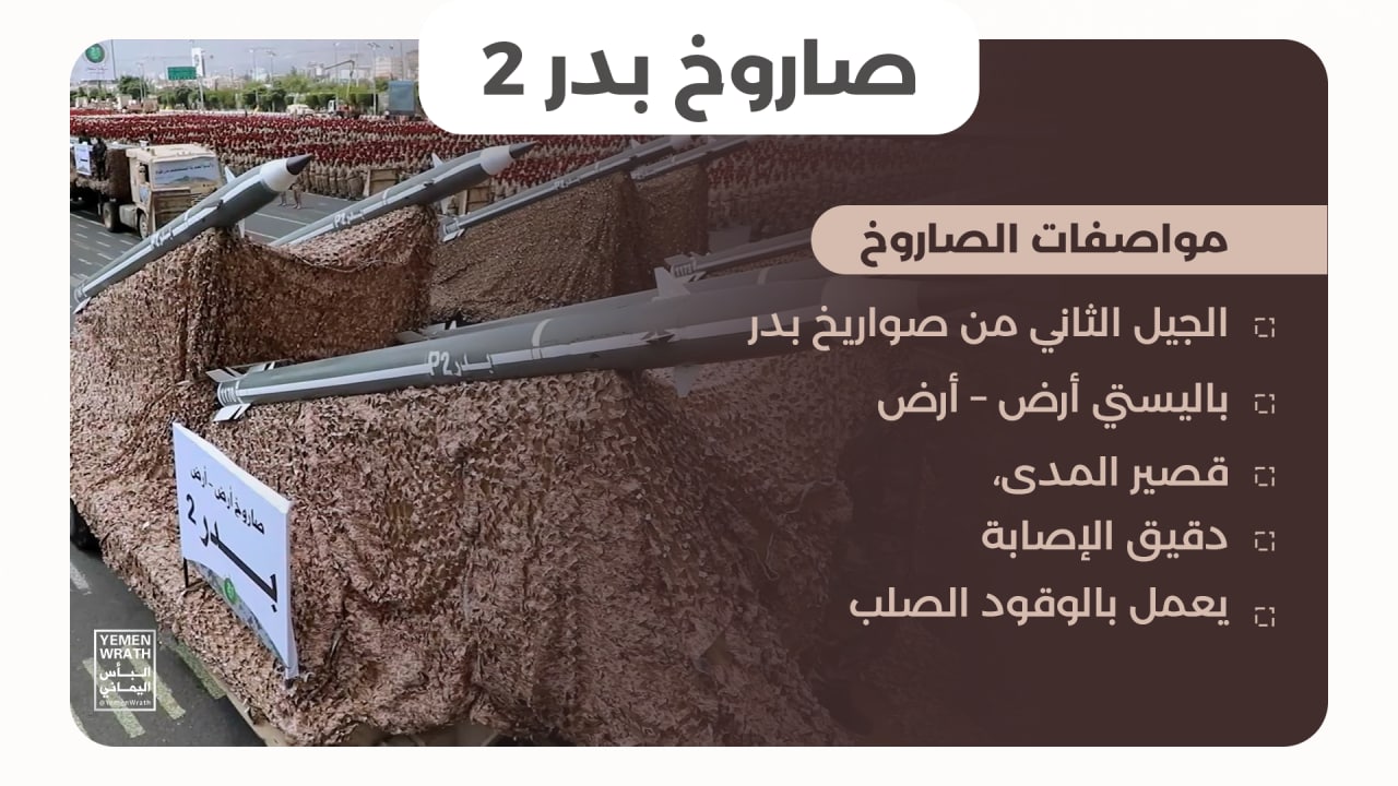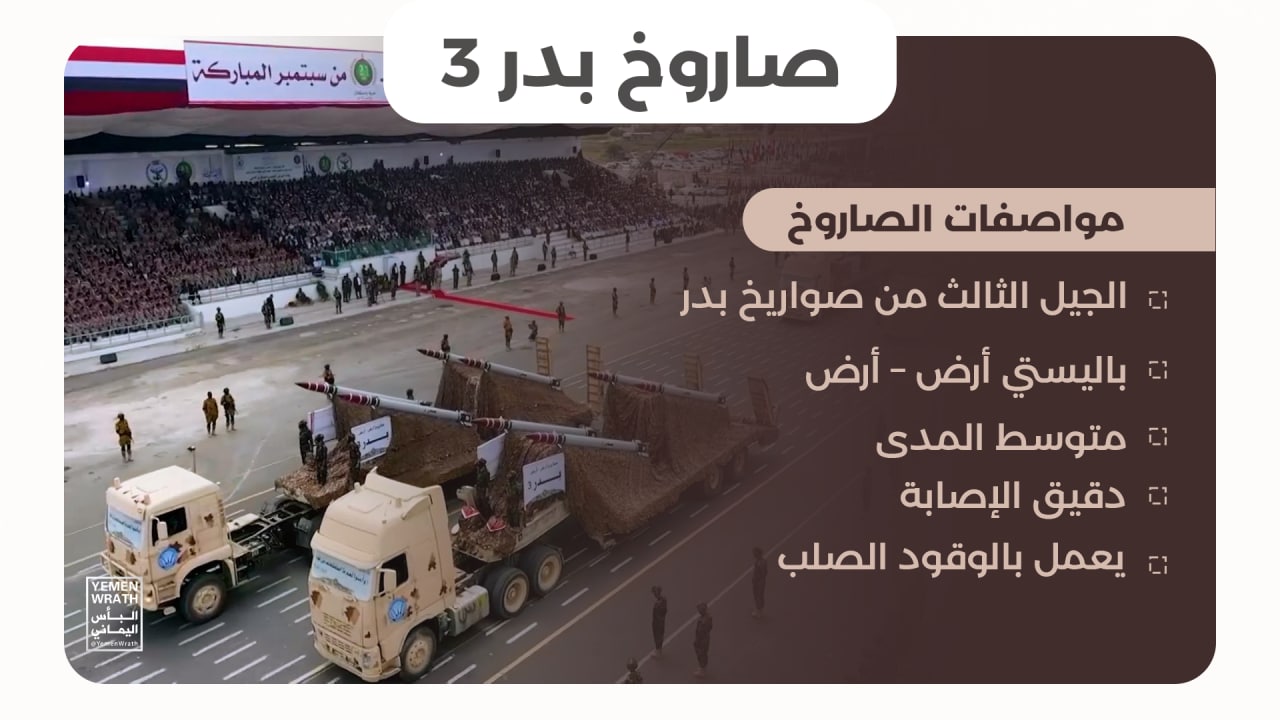 تعرف على صاروخ “بدر 3” الباليستي الذي أزيح الستار عنه مؤخراً خلال الاستعراض العسكري في العاصمة صنعاء