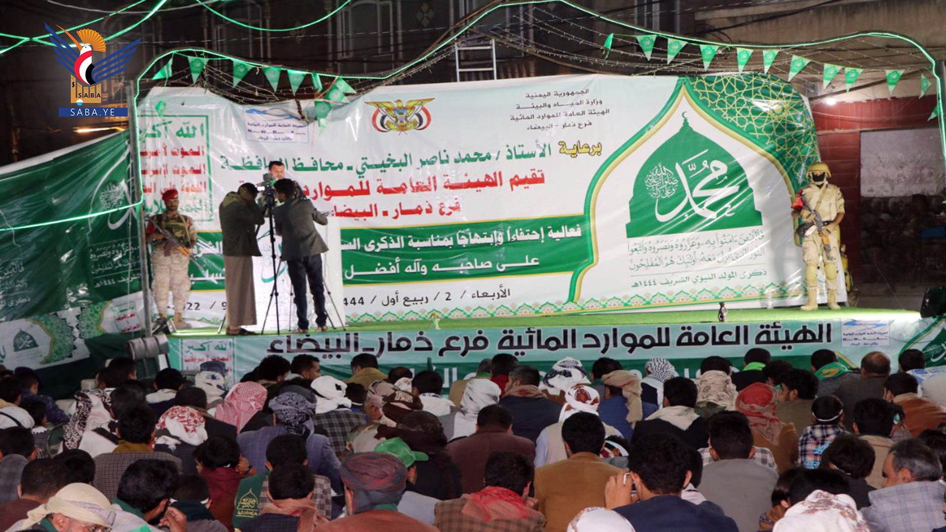 حيث نظم مكتب الهيئة العامة للموارد المائية بمحافظتي ذمار والبيضاء، وأسرة الشهيد علي بن علي الوريث وأسر الشهداء في حارة مربع الإمام زيد بن علي بالقطاع الغربي بمدينة ذمار ، وأبناء حارات (الناصر و المزيجي والربوع و الصلعة الوسطي ) بالقطاع الأوسط بالمدينة أمسيات خطابية وفنية احتفاء بهذه المناسبة الدينية الجليلة.