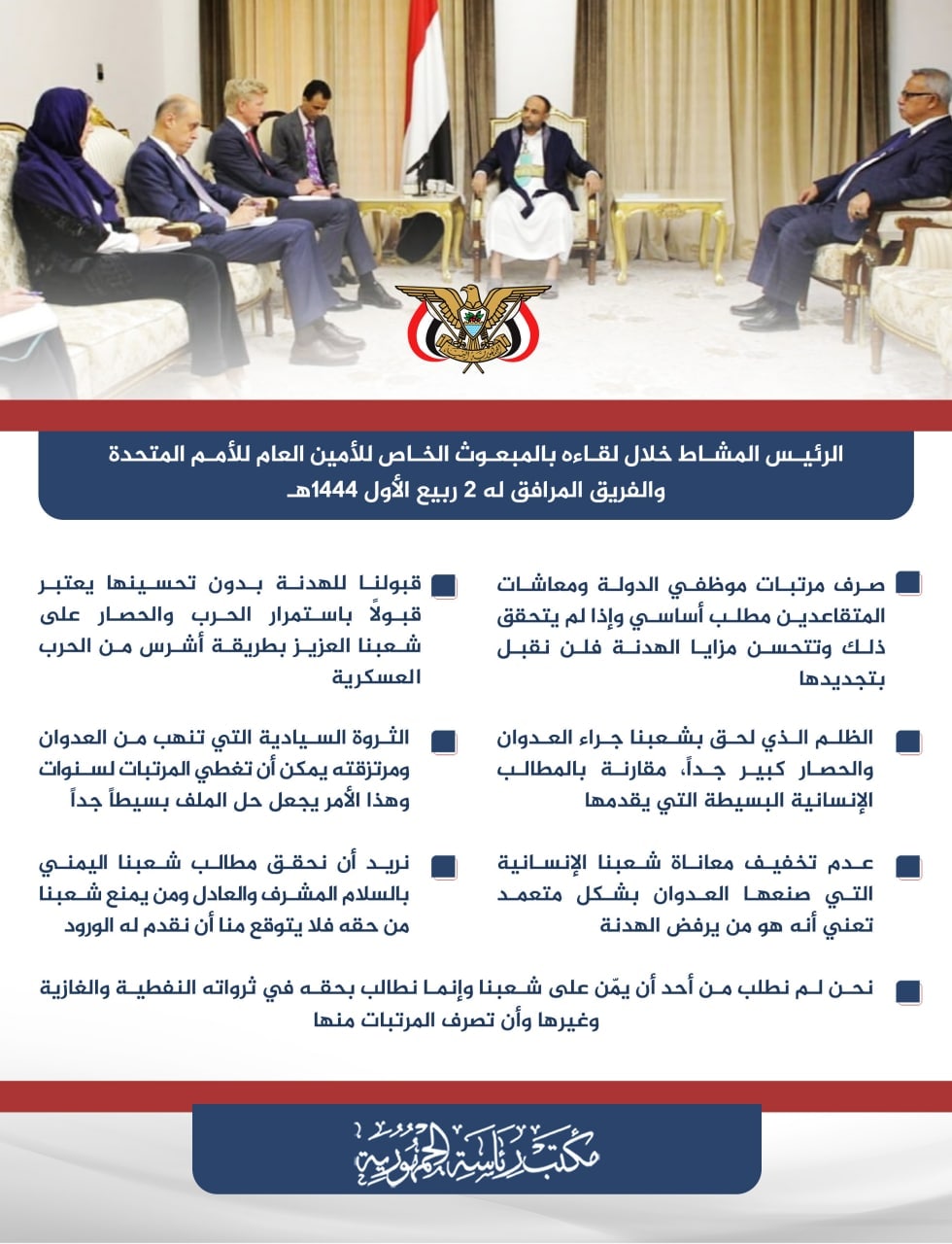 وقال الرئيس المشاط، خلال اللقاء الذي جرى لمناقشة جهود الأمم المتحدة لتوسيع الهدنة في ظل تعنت دول العدوان الأمريكي السعودي على المطالب الإنسانية المحقة للشعب اليمني والذي تسعى إلى تفريغ أي هدنة محتملة من محتواها ،“إن الظلم الذي لحق بشعبنا اليمني جراء العدوان والحصار كبير جداً، مقارنة بالمطالب الإنسانية البسيطة التي يقدمها من صرف لمرتبات كافة موظفي الدولة ومعاشات المتقاعدين، ورفع الحصار خصوصاً في ظل النهب المستمر للثروة السيادية من قبل العدوان ومرتزقته والتي يمكن أن تغطي المرتبات لسنوات والذي يجعل حل هذا الملف بسيط جداً لولا إرادة دول العدوان في استمرار معاناة أبناء الشعب اليمني”.