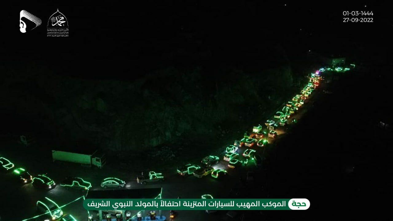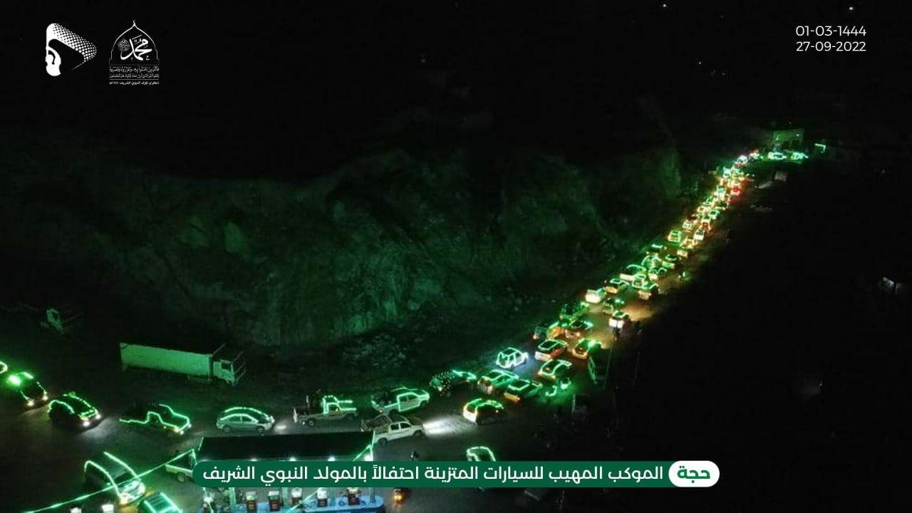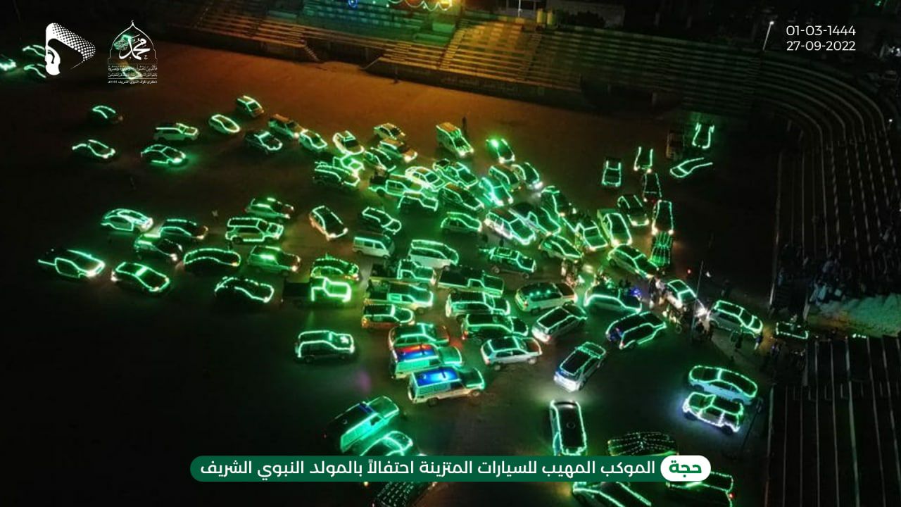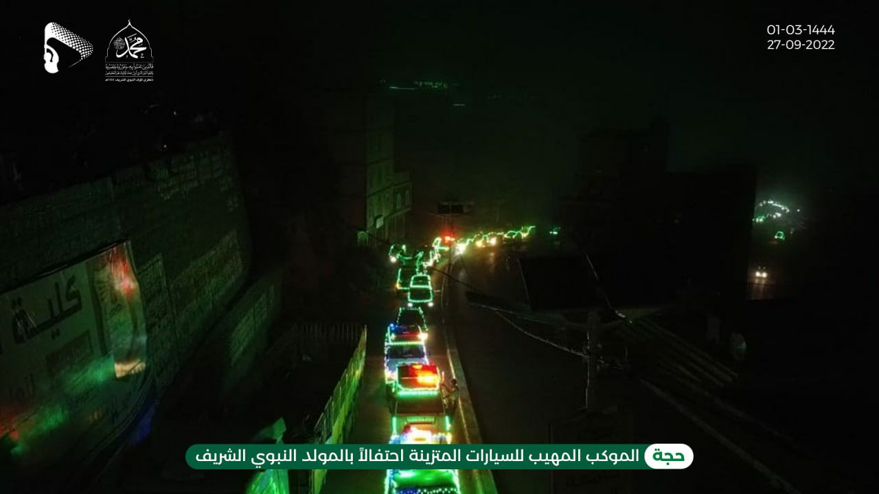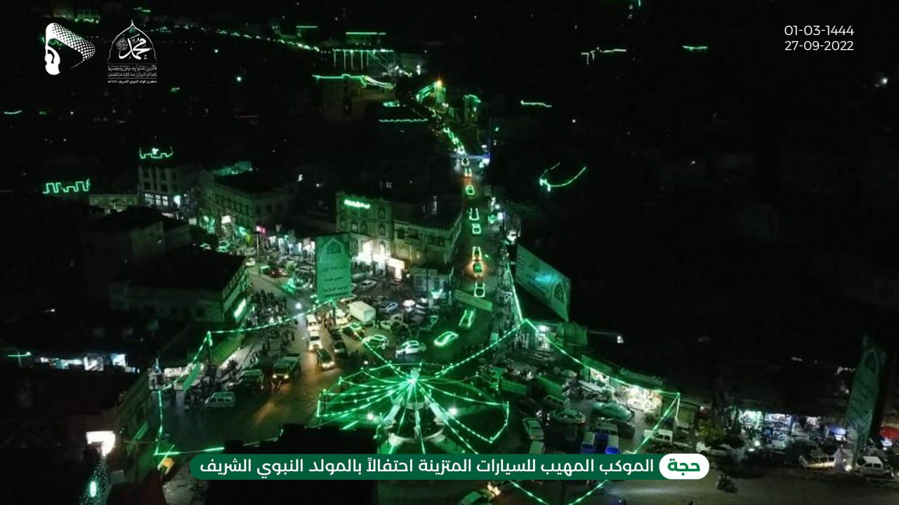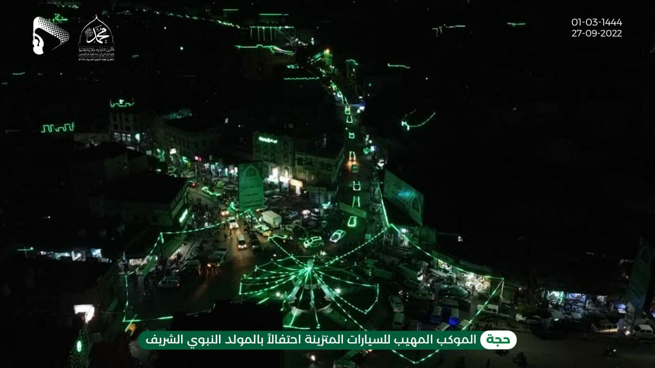 جابت أكثر من 300 سيارة لمواطنين مزينة بأنوار خضراء شوارع مدينة حجة إحتفاءً بقدوم بالمولد النبوي الشريف.
