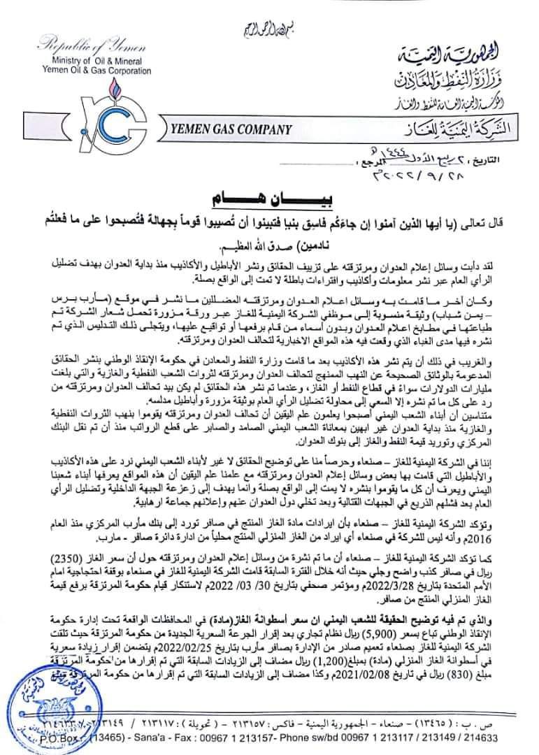 وقالت الشركة: لقد دأبت وسائل إعلام العدوان ومرتزقته على تزييف الحقائق ونشر الأباطيل والأكاذيب منذ بداية العدوان بهدف تضليل الرأي العام عبر نشر معلومات وأكاذيب وافتراءات باطلة لا تمت إلى الواقع بصلة، أخرها ما نشر في موقع (مأرب برس– يمن شباب) التابع لمرتزقة العدوان في مأرب، التي قامت بنشر وثيقة مزورة منسوبة إلى موظفي الشركة اليمنية للغاز تحمل شعار الشركة تم طباعتها في مطابخ اعلام العدوان وبدون أسماء من قام برفعها أو تواقيع عليها، ويتجلى ذلك التدليس الذي تم نشره فيها مدى الغباء والسقوط الأخلاقي الذي وقعت فيه هذه المواقع الاخبارية لتحالف العدوان ومرتزقته.