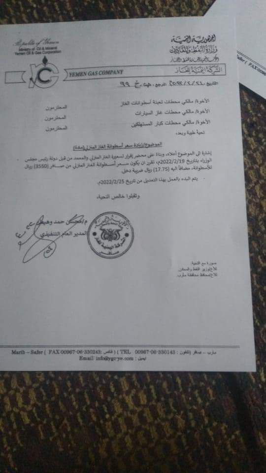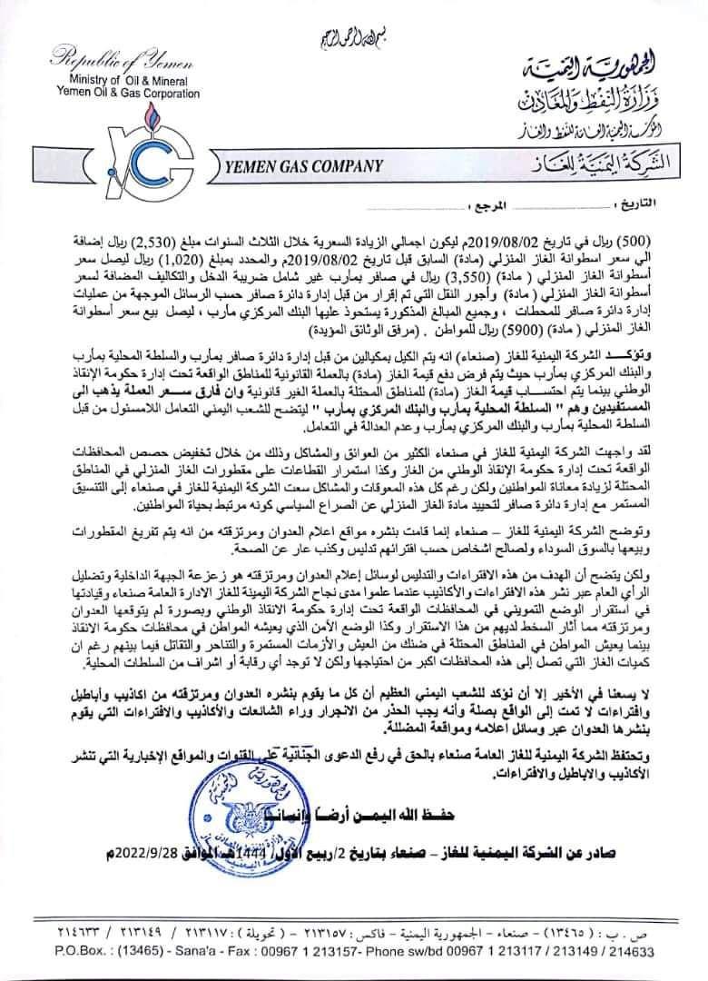 وأشارت الشركة إلى أنها قد كشفت الحقيقية كاملة للشعب اليمني خلال المؤتمر الصحفي، وان سعر أسطوانة الغاز (مادة) في المحافظات الواقعة تحت إدارة حكومة الإنقاذ الوطني تباع بسعر (5,900) ريال نظام تجاري بعد إقرار الجرعة السعرية الجديدة من حكومة المرتزقة حيث تلقت الشركة اليمنية للغاز بصنعاء تعميم صادر من الإدارة بصافر مأرب بتاريخ 25/02/2022م يتضمن إقرار زيادة سعرية في أسطوانة الغاز المنزلي (مادة) بمبلغ (1,200) ريال مضاف إلى الزيادات السابقة التي تم إقرارها من حكومة المرتزقة مبلغ (830) ريالاً في تاريخ 08/02/2021م.