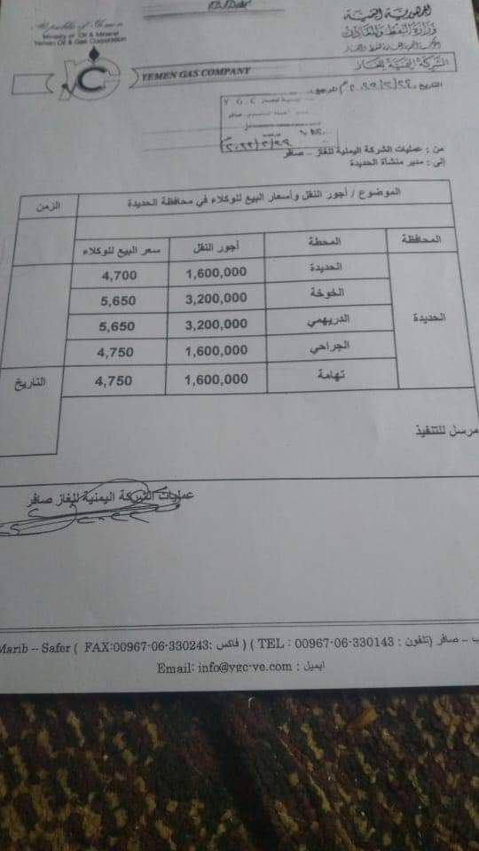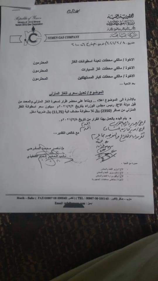 وقالت الشركة: إلى جانب ما سبق فقد تم إضافة إلى الزيادات السابقة التي تم إقرارها من حكومة المرتزقة مبلغ (500) ريال في تاريخ 02/08/2019م ليكون اجمالي الزيادة السعرية خلال الثلاث السنوات مبلغ (2,530) ريالاً إضافة الي سعر اسطوانة الغاز المنزلي (مادة) السابق قبل تاريخ 02/08/2019م والمحدد بمبلغ (1,020) ريالاً ليصل شراء أسطوانة الغاز المنزلي ( مادة) (3,550) ريالاً في صافر بمأرب غير شامل ضريبة الدخل والتكاليف المضافة لسعر أسطوانة الغاز المنزلي ( مادة) وأجور النقل التي تم إقرار من قبل إدارة دائرة صافر حسب الرسائل الموجهة من عمليات إدارة دائرة صافر للمحطات.