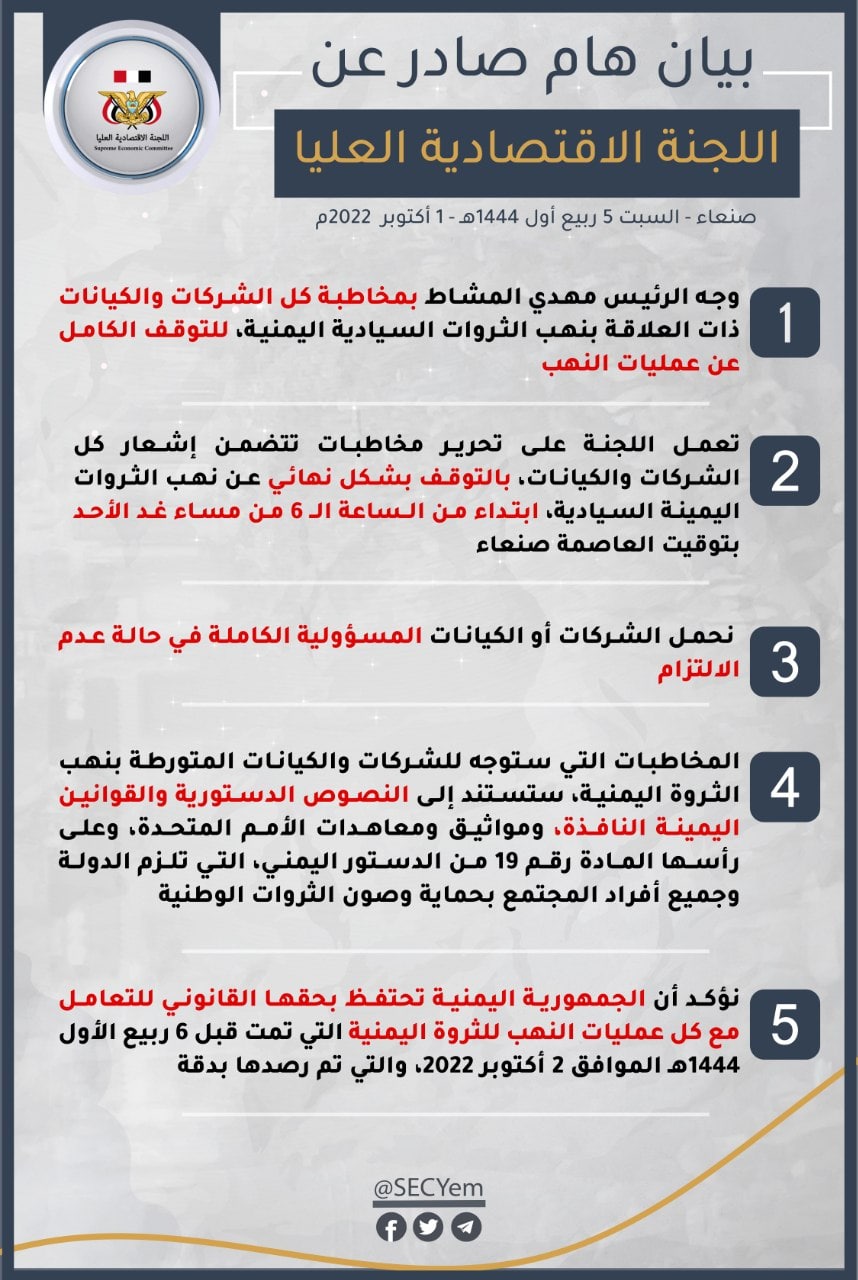 وأوضح بيان صادر عن اللجنة الاقتصادية العليا، أن اللجنة تعكف حاليا بالتنسيق مع الجهات المختصة، على تحرير تلك المخاطبات التي تتضمن إشعار كل الشركات والكيانات، بأن عليها التوقف بشكل نهائي عن نهب الثروات اليمنية السيادية، ابتداء من الساعة السادسة من مساء اليوم الأحد بتوقيت العاصمة صنعاء، السادس من شهر ربيع الأول 1444هـ الموافق 2 تشرين الأول/ أكتوبر 2022م، على أن تتحمل الشركات أو الكيانات المسؤولية الكاملة في حال عدم الالتزام.