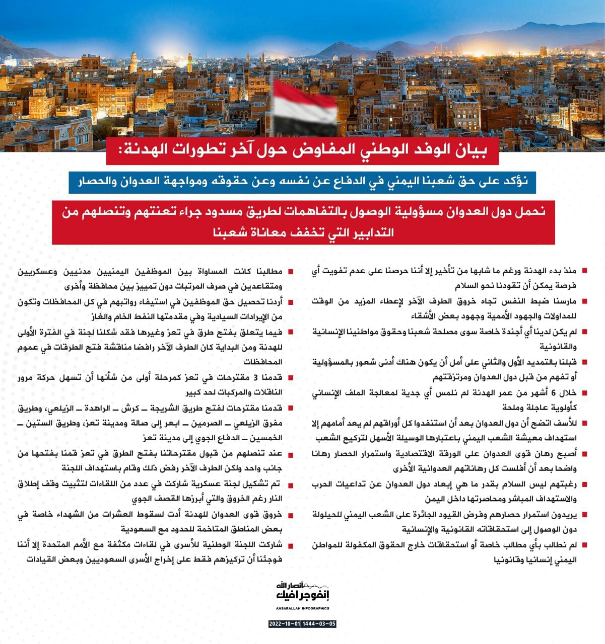 وأصدر الوفد بياناً توضيحياً أكد فيه أن دول العدوان تنصلت عن تنفيذ مختلف بنود اتفاق الهدنة طيلة الأشهر الستة الماضية برغم موافقة صنعاء على تمديده مرتين، من أجل عطاء فرصة لإحراز تقدم.