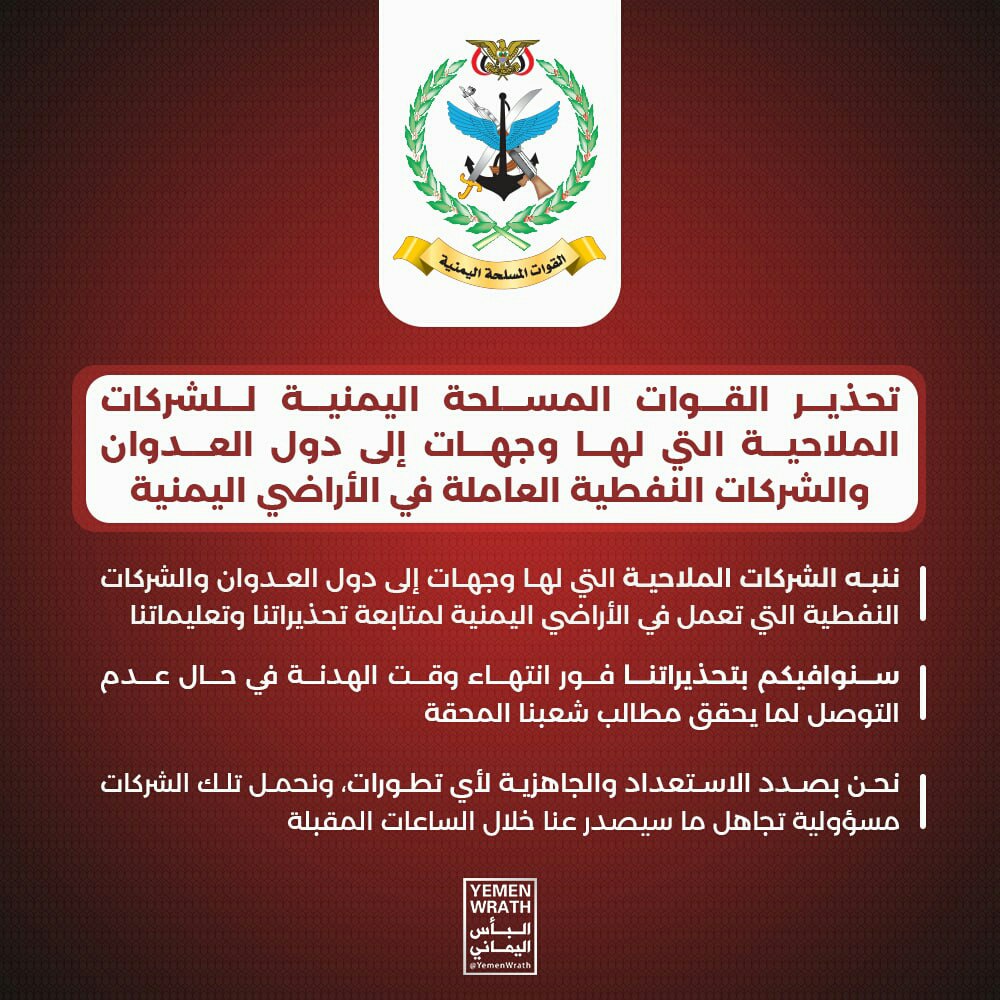 ونبهت القوات المسلحة “الشركات الملاحية التي لها وجهات إلى دول العدوان والشركات التي تعمل في الأراضي اليمنية لمتابعة تحذيراتنا وتعليماتنا”.