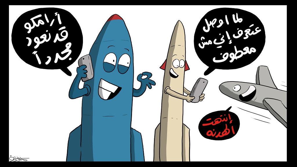 ويظهر الكاريكاتير صاروخ (قدس) وهو يجري مكالمة مع شركة أرامكو السعودية مبلغا إياها ما أعلنه متحدث القوات المسلحة اليمنية العميد يحيى سريع “قد نعود مجددا”، فيما يظهر صاروخ (حاطم) وهو يكتب تعليقاً على ناشطي العدوان الذين نشروا صورة مفبركة له في العرض العسكري الأخير بالعاصمة صنعاء وهو معطوف الرأس، كما يظهر طائرة مسيرة وكأنها ترقص فرحا وتردد “انتهت الهدنة”.
