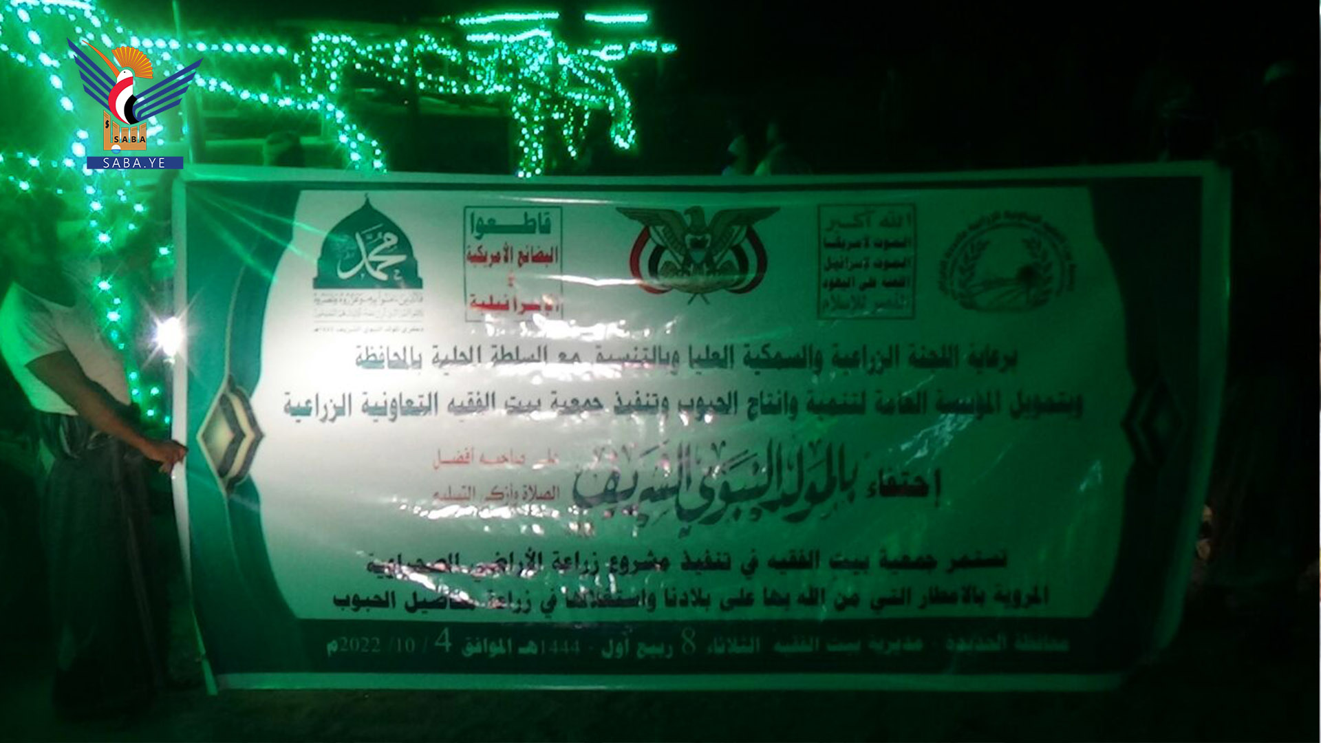 نظمت جمعية بيت الفقيه التعاونية الزراعية متعددة الأغراض بمحافظة الحديدة، أمسية ثقافية وعرضا لعشرات الحراثات المزينة بالأضواء، احتفاء بذكرى المولد النبوي الشريف.