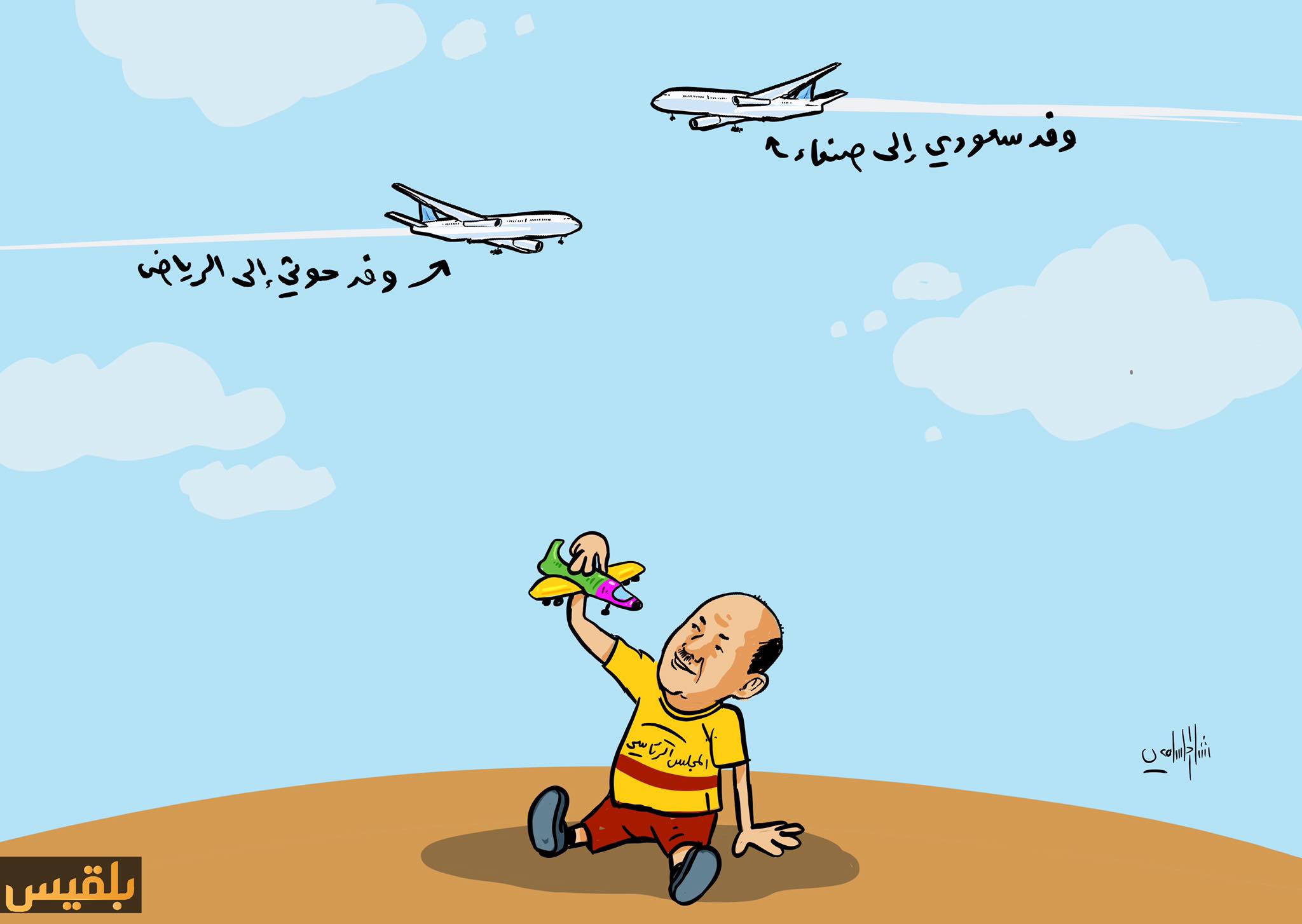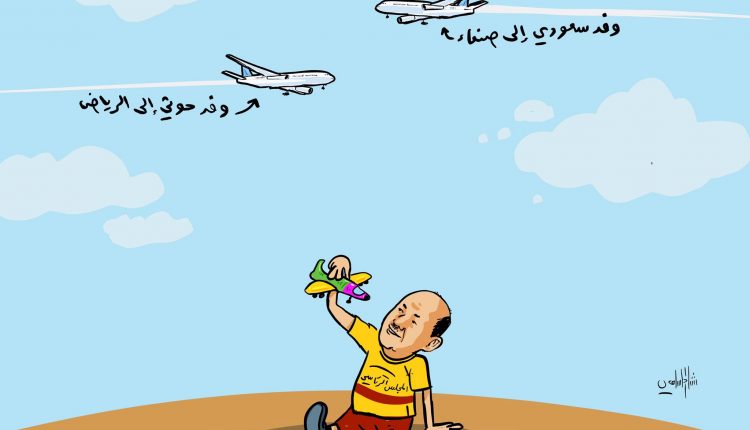 ويظهر الكاريكاتير المرتزق “رشاد العليمي” كطفل يلعب بطائرة بلاستيكية، بينما تمر من فوقه طائرتان تقلان وفدي صنعاء والرياض.