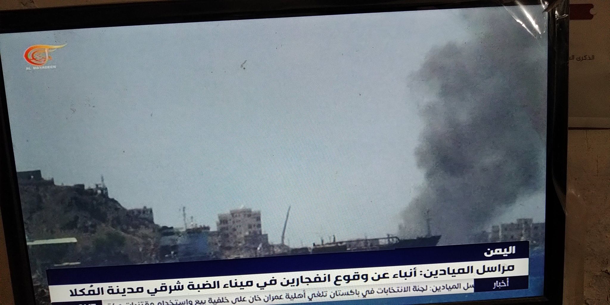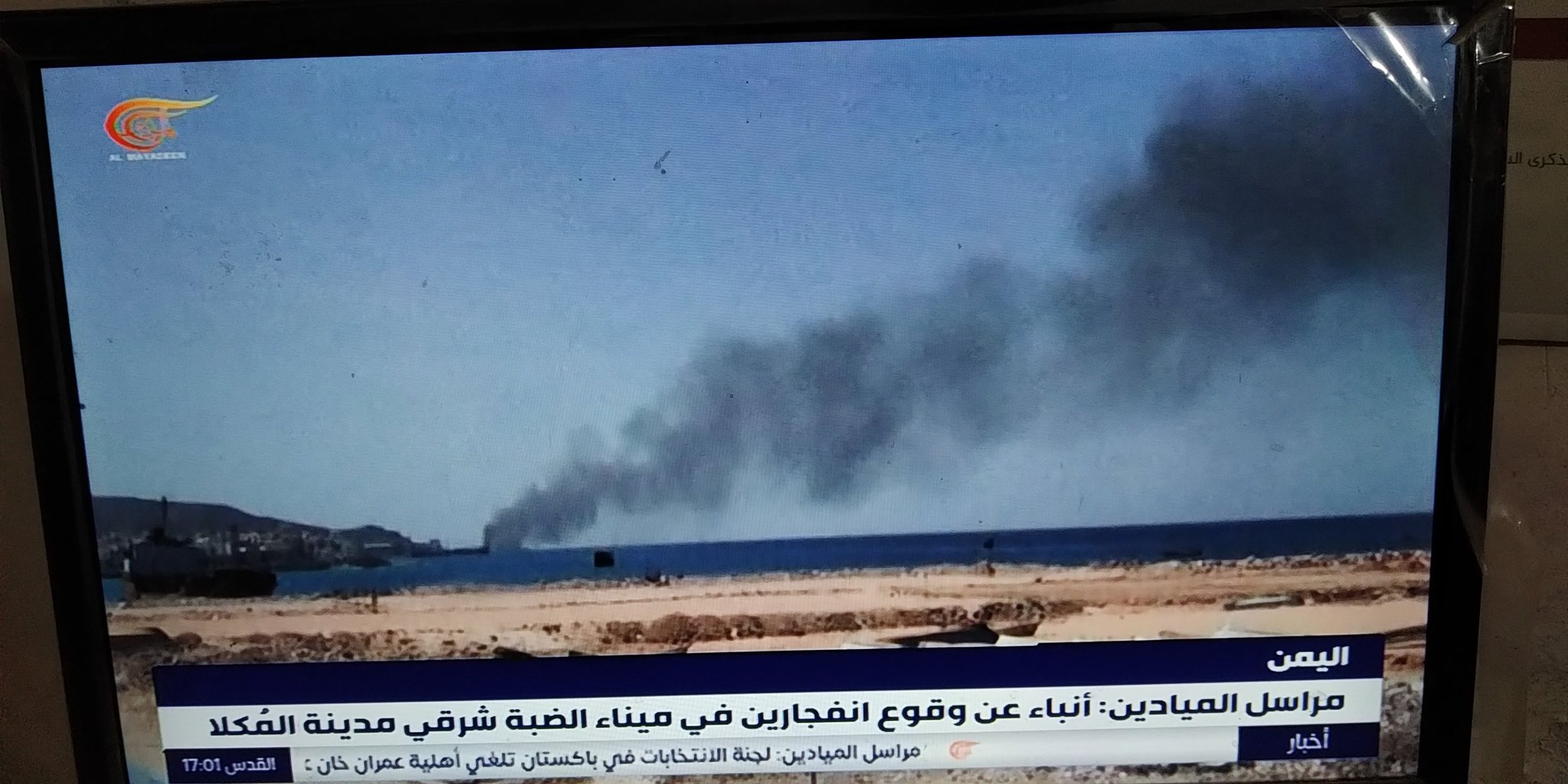 ونشرت قناة الميادين الفضائية صوراً حصرية من ميناء الضبة بمحافظة حضرموت المحتلة لحظة استهدافه بعدد من الطائرات المسيرة.