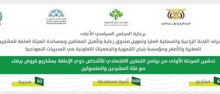 دشنت اللجنة الزراعية والسمكية العليا ومؤسسة بنيان التنموية اليوم المرحلة الاولى من برنامج التمكين الاقتصادي للأشخاص ذوي الإعاقة بتمويل صندوق رعاية وتأهيل المعاقين وبمبلغ اجمالي 3مليار ريال وسيستفيد من البرنامج 3000 الف شخص ذي اعاقة وذلك على مرحلتين.