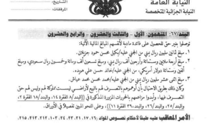 وأكدت النيابة الجزائية المتخصصة في تقرير اتهامها أن الأمر المعاقب عليه طبقا لأحكام نصوص المواد ( 16-17-21- 23-24-103-212-213-215-217-219-310) من القرار الجمهوري بالقانون رقم ( ١٢ ) لسنة 1994م .بشأن الجرائم والعقوبات، والمادة ( ٨٧ مكرر²)من القرار الجمهوري بالقانون رقم ( ٣٢ ) لسنة 2008م بشأن الوقف الشرعي، المادتين ( ٦ ، ٤٧ ) من القرار الجمهوري بالقانون رقم ( ٢١ ) لسنة 1995م، بشأن أراضي وعقارات الدولة، والقانون رقم ( ١٦ )لسنة 1963م بشأن أموال وممتلكات أسرة حميد الدين المصادرة وانه وعملا بنص المادة ( ٢٢١ )من القرار الجمهوري بالقانون رقم ( ١٣ ) لسنة 1994م بشأن الإجراءات الجزائية.