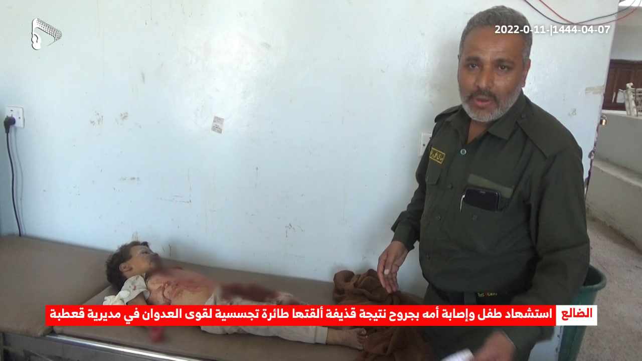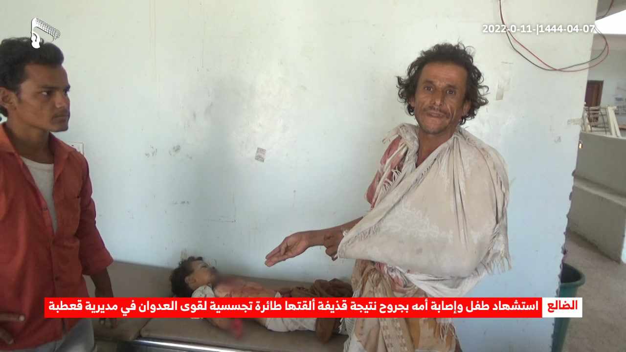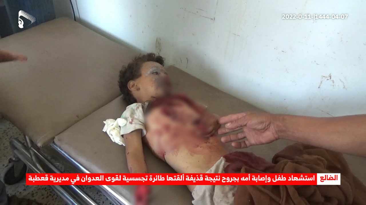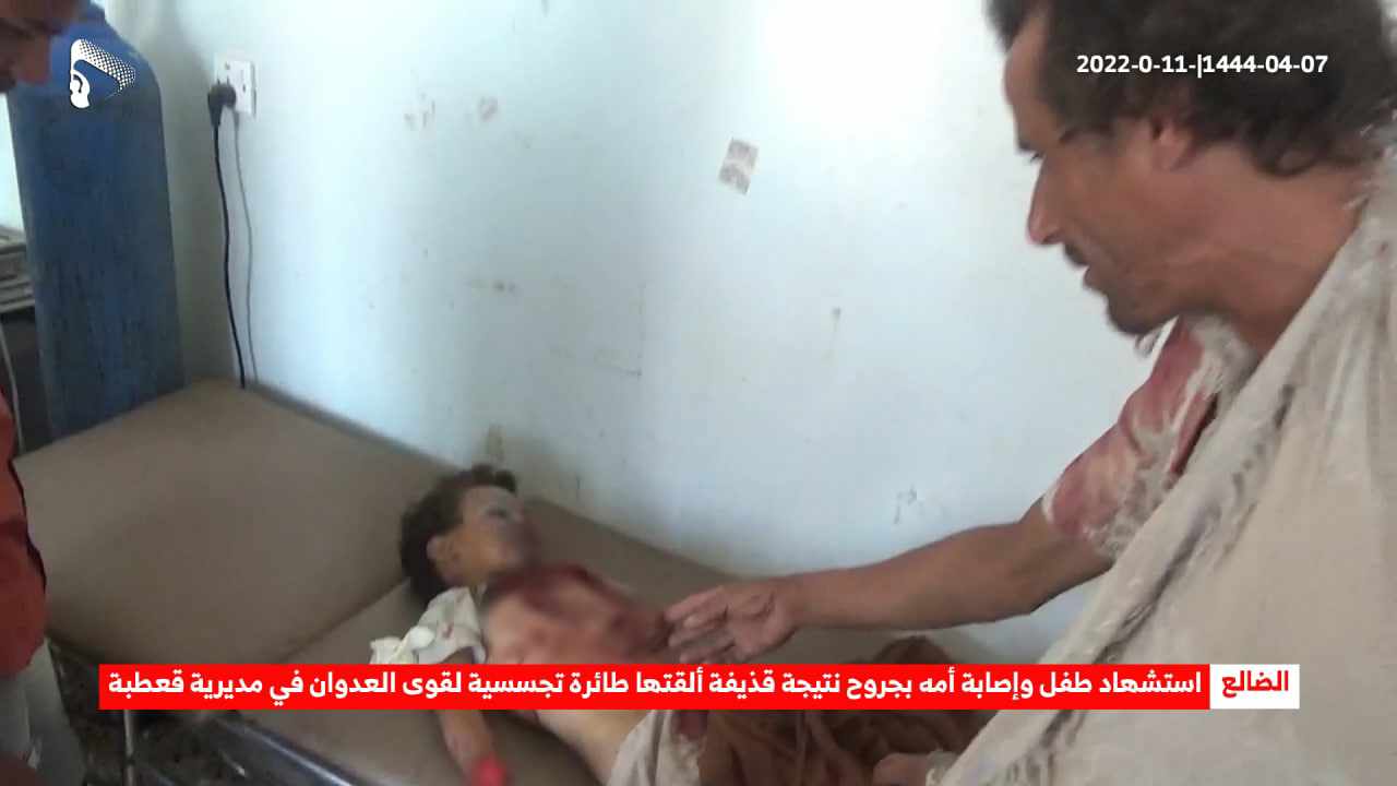 وفي الضالع، استشهد طفل وأصيبت أمه، الثلاثاء الماضي، في غارة جوية لطيران تجسسي تابع لتحالف العدوان الأمريكي السعودي الإماراتي في مديرية قعطبة شمال المحافظة.