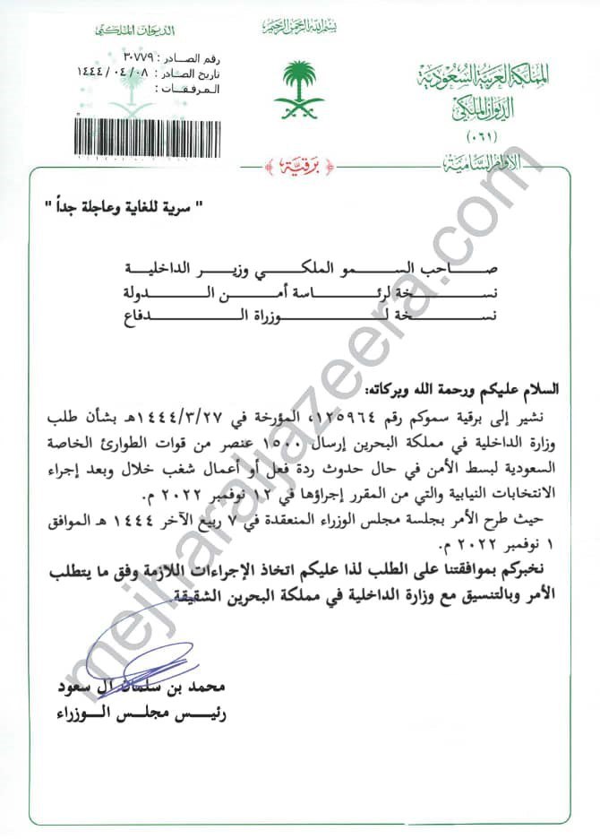 وتناول ناشطون في مواقع التواصل الاجتماعي وثيقة هامة للديوان الملكي السعودي، بتاريخ 8 من ربيع الثاني 1444هـ، بموجبها تمت الموافقة على طلب مملكة البحرين إرسال قوات وعناصر من قوات الطوارئ الخاصة السعودية.