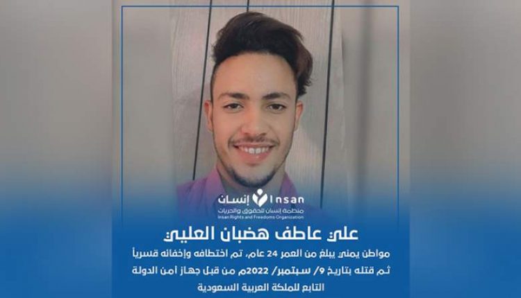 أوضحت المنظمة في بيان أنها تلقت بلاغا من أسرة المغترب في السعودية العليي من أبناء محافظة المحويت أكدت فيه أنه قتل على أيدي منتسبي جهاز أمن الدولة في الرياض.