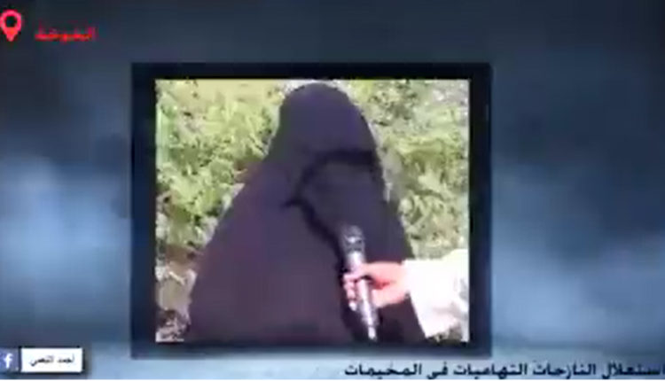 وتداول نشطاء مقابلة مصورة أجراها أحد الإعلاميين العاملين في مناطق سيطرة العدوان بالخوخة مع إحدى النازحات، حيث كشفت الأخيرة خلال المقابلة أن عناصر المرتزقة يقومون باقتحام المخيمات ليلا والاعتداء على النساء.