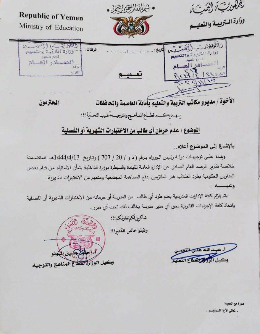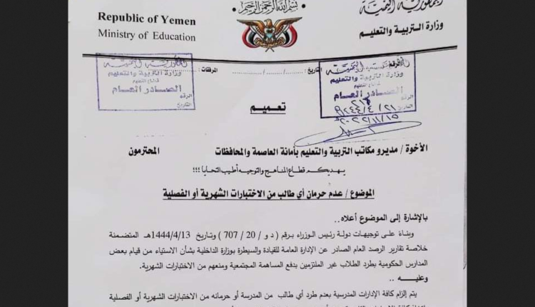 أصدرت وزارة التربية والتعليم تعميم جديد وملزم لجميع إدارات المدارس الحكومية في العاصمة صنعاء والمحافظات بشأن الاختبارات وضرورة حضور جميع الطلاب وعدم حرمان أي طالب منها.