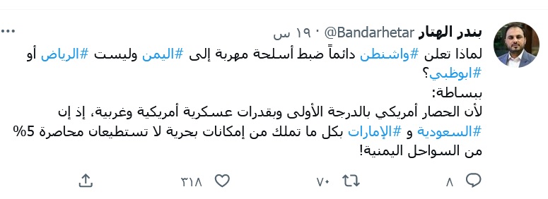 كشف ال‏‏‏‏‏صحافي اليمني بندر الهتار سر إعلان البحرية الأمريكية دائماً ضبط شحنات أسلحة مهربة إلى اليمن وليس السعودية أو الإمارات.