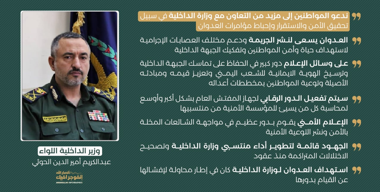 وشدد على أن استهداف العدوان لوزارة الداخلية كان في إطار محاولته لإفشالها عن القيام بدورها، مؤكداً أن الجهود قائمة لتطوير أداء منتسبي وزارة الداخلية وتصحيح الاختلالات المتراكمة منذ عقود.