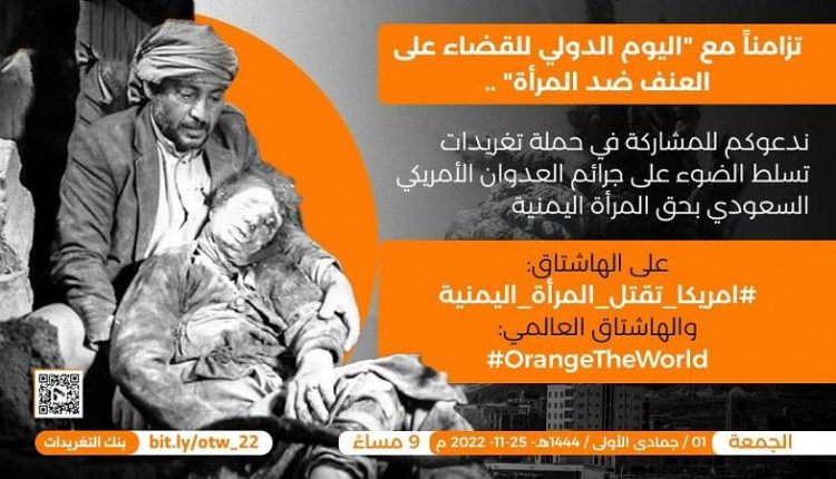 ودعا المنظمون للمشاركة الواسعة في حملة التغريدات التي تأتي تزامناً مع “اليوم الدولي للقضاء على العنف ضد المرأة”، إلى تسليط الضوء على جرائم العدوان الأمريكي السعودي بحق المرأة اليمنية على الهاشتاقين: