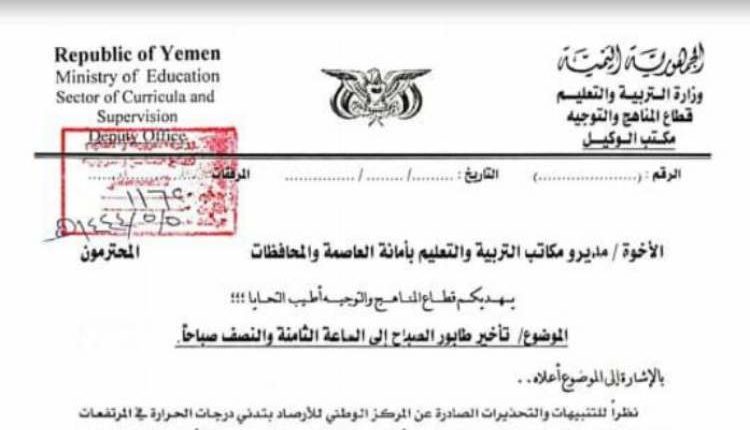 وجاء في التعميم ان تأخير الطابور يأتي حفاظاً على الطلاب من موجة البرد الشديد.. مع وضع معالجات للمدارس التي تعمل فترتين بما يضمن الحفاظ على نصاب الحصص.