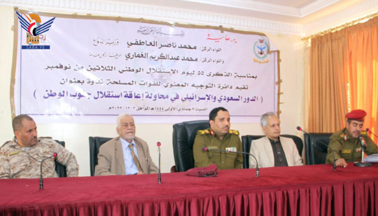 وأوضح بن عامر – خلال الفعالية الثقافية التي نظّمتها دائرة التوجيه المعنوي اليوم بمناسبة الاحتفال بيوم الـ30 من نوفمبر في ذكراه الـ55 للاستقلال بحضور مستشار الرئاسة البروفيسور عبدالعزيز الترب وعدد من الأكاديميين والباحثين في مجال التاريخ- أن التحرّك السعودي بالتزامن مع التحرك الإسرائيلي جاء في إطار محاولة إيجاد كيان العدو الإسرائيلي موطئ قدم له في أهم المواقع الإستراتيجية لليمن من الموانئ والمنافذ البحرية في البحر الأحمر والبحر العربي ومضيق باب المندب.