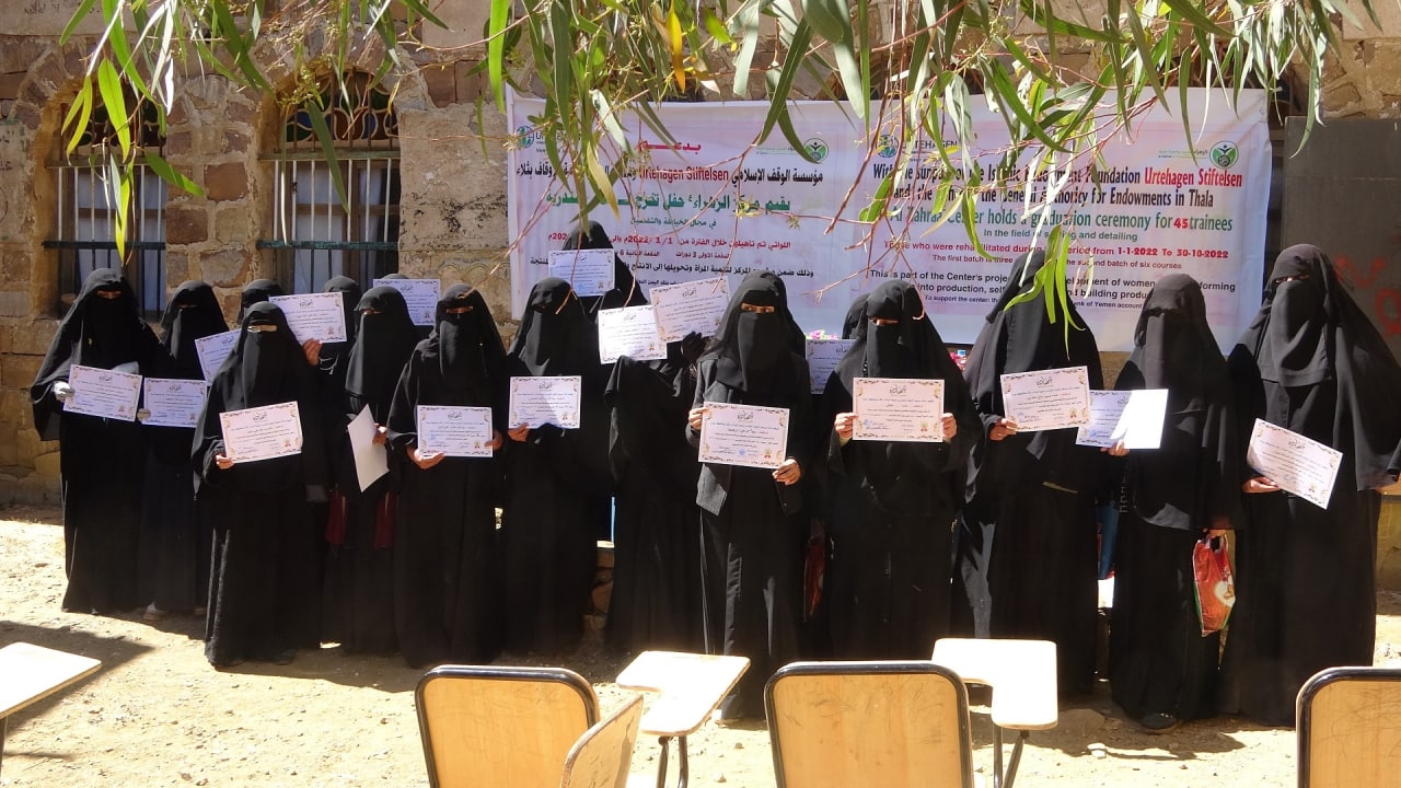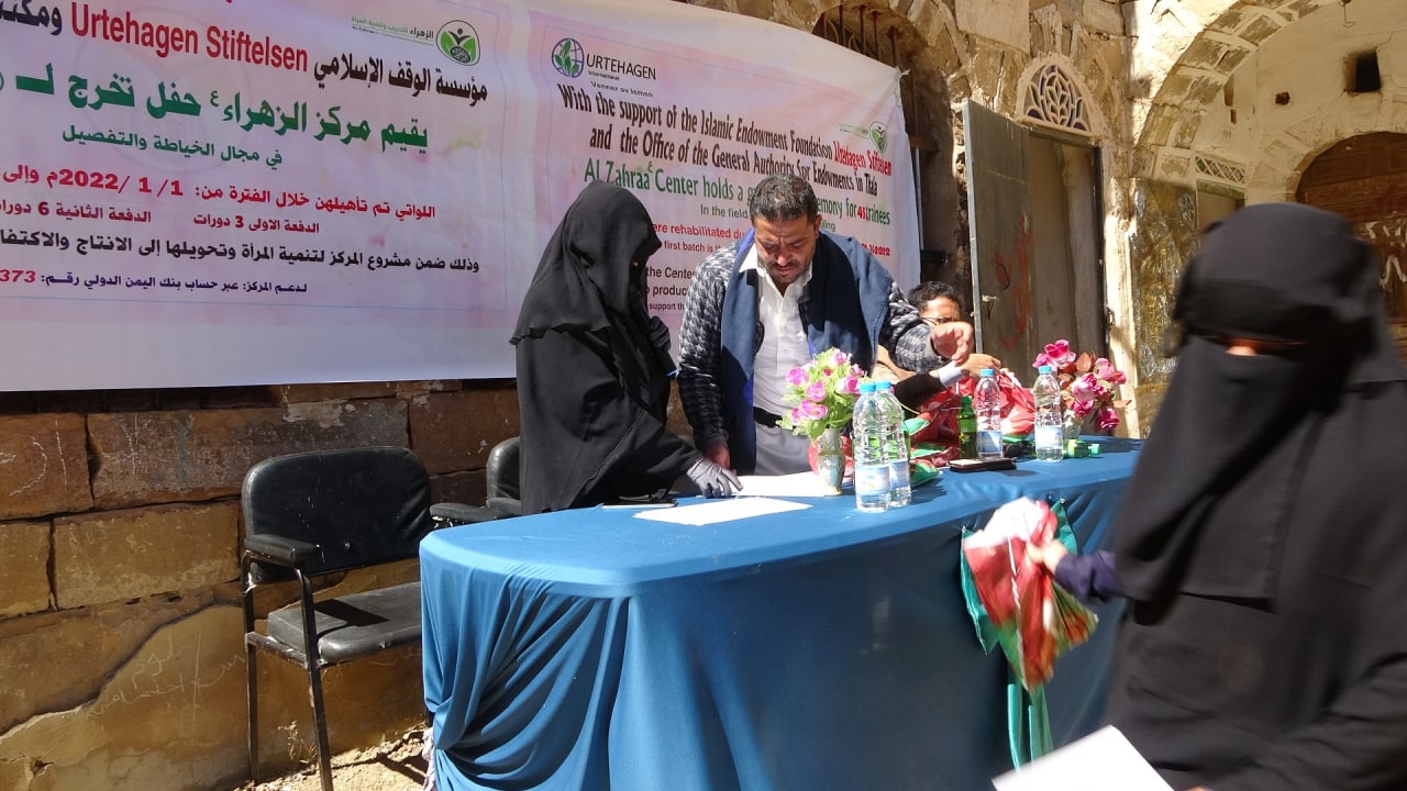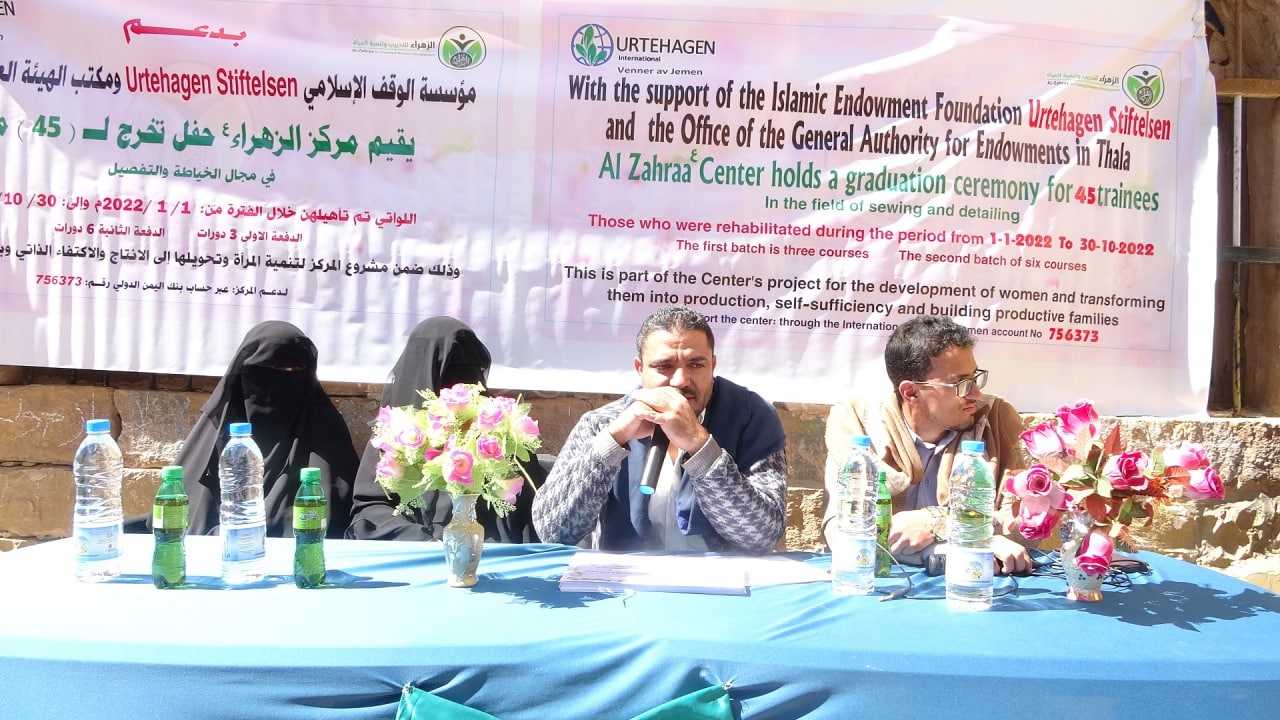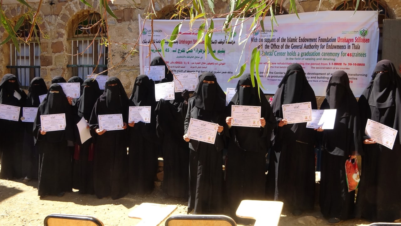 بمناسبة الذكرى السنوية للشهيد 1444هـ احتفل مركز الزهراء بتأهيل وتخرج 45 متدربة من أسر الشهداء والجرحى والمرابطين بمديرية ثلاء محافظة عمران، بدعم من مؤسسة الوقف الاسلامي Urtehagen Stiftelsen ومكتب الهيئة العامة للأوقاف بالمديرية.