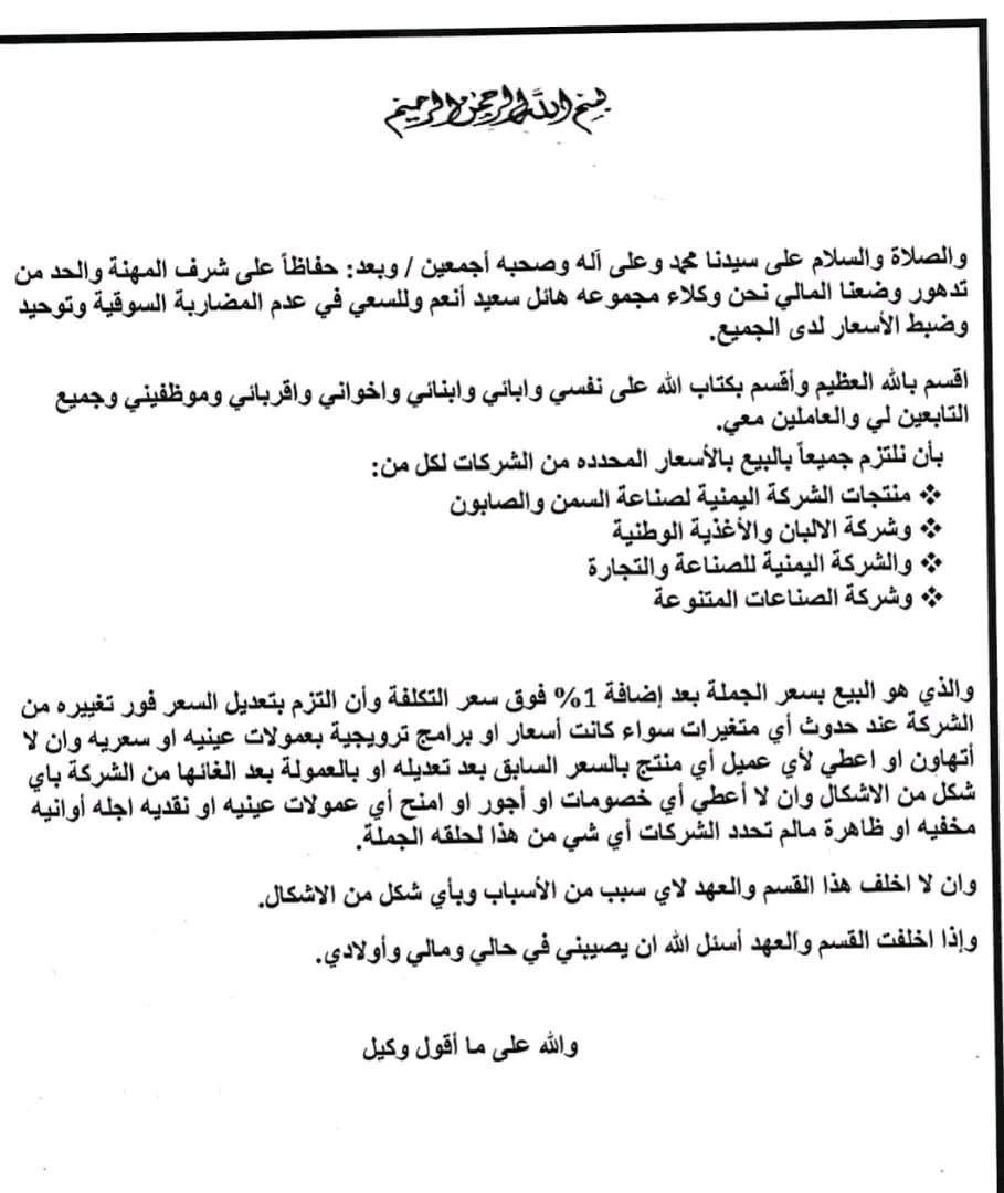 كشفت فيديوهات لأداء القسم تقدمها مجموعة شركات هائل سعيد أنعم للتجار، على أن لا يلتزموا بأي قائمة أسعار يتم إنزالها إلى السوق من قبل الجهات المعنية بوزارة الصناعة والتجارة في صنعاء، وأن القائمة المعتمدة هي قائمتهم وأسعارهم فقط.
