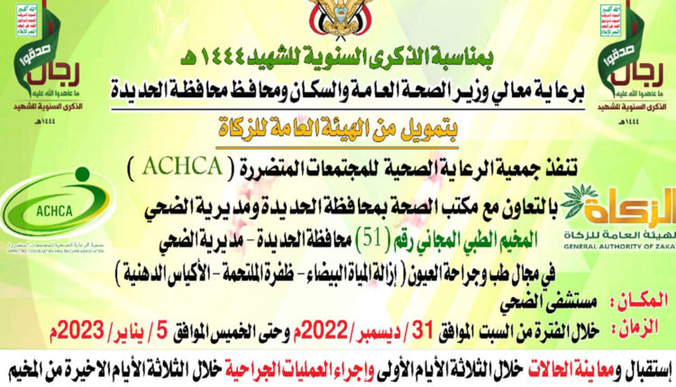 أفق نيوز | تدشن جمعية الرعاية الصحية للمجتمعات المتضررة، السبت القادم، المخيم المجاني الـ51 لطب وجراحة العيون بمديرية الضحي محافظة الحديدة بالتنسيق مع وزارة الصحة العامة والسكان، وبتمويل الهيئة العامة للزكاة.