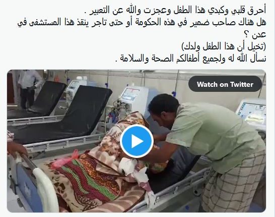 وعلق على الفيديو قائلا: أحرق قلبي وكبدي هذا الطفل وعجزت والله عن التعبير . هل هناك صاحب ضمير في هذه الحكومة أو حتى تاجر ينقذ هذا المستشفى في عدن ؟ (تخيل أن هذا الطفل ولدك) نسأل الله له ولجميع أطفالكم الصحة والسلامة .