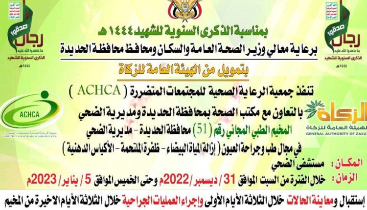 بتمويل من الهيئة العامة للزكاة.. اليوم السبت تدشين مخيم مجاني للعيون في مديرية الضحي بالحديدة