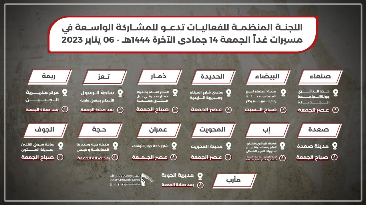 ففي صنعاء العاصمة والمحافظة، حددت اللجنة المنظمة ساحة الخط الدائري- جولة الجامعة الجديدة – مكانا لمسيرة (الحصار حرب) عصر الجمعة.