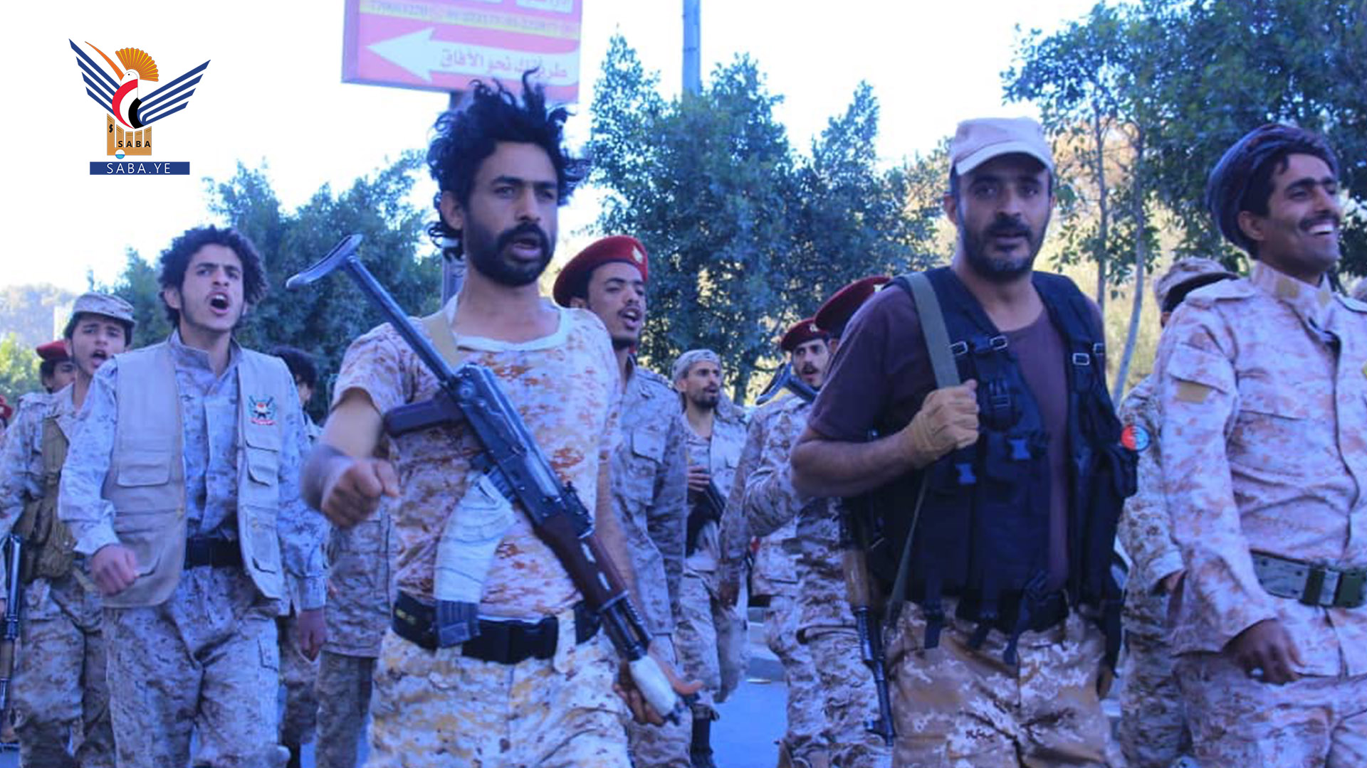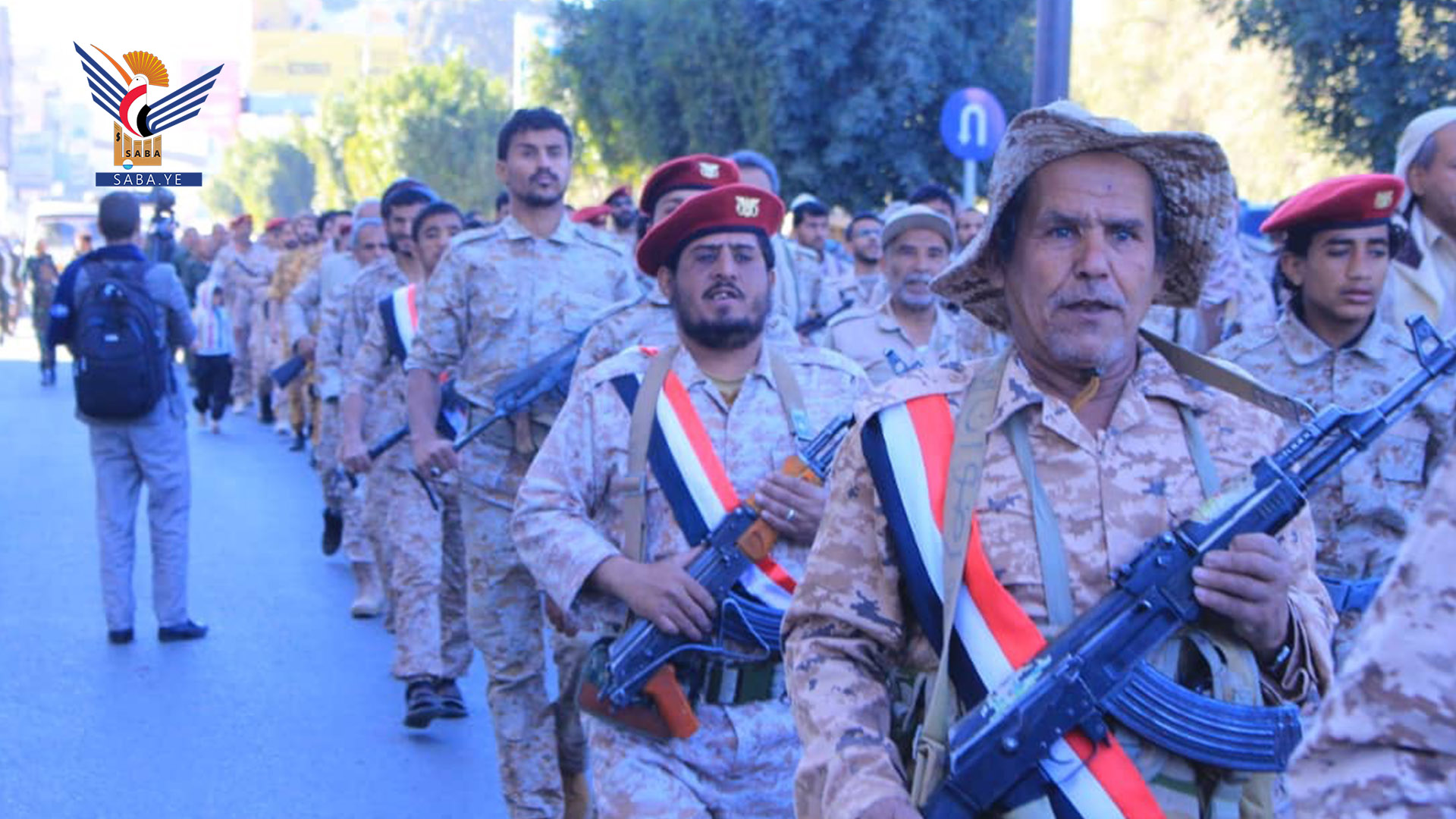 وردد المشاركون في العرض، الهتافات والشعارات المؤكدة على الجهوزية والنفير لرفد الجبهات بقوافل الرجال والمدد ومواصلة الصمود والتضحية دفاعاً عن الوطن ومواجهة العدوان ورفع الحصار.