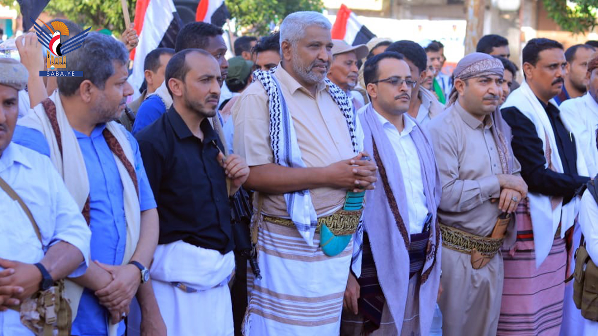 وفي المسيرة التي تقدمها المحافظ محمد قحيم ونائب مدير مكتب رئاسة الجمهورية فهد العزي وأمين عام رئاسة الوزراء طه السفياني ونائب وزير الداخلية اللواء عبدالمجيد المرتضى وعدد من أعضاء مجلسي النواب والشورى، اعتبر وكيل أول المحافظة أحمد البشري، في كلمة السلطة المحلية، استمرار التواطؤ والتآمر الدولي بعد ثماني سنوات من القتل والحصار والتدمير والتشريد، دليلاً على عدم حيادية المجتمع الدولي والمتاجرة بالشعارات الزائفة لحقوق الإنسان وفقاعات القوانين لتنفيذ مخططات استعمارية.