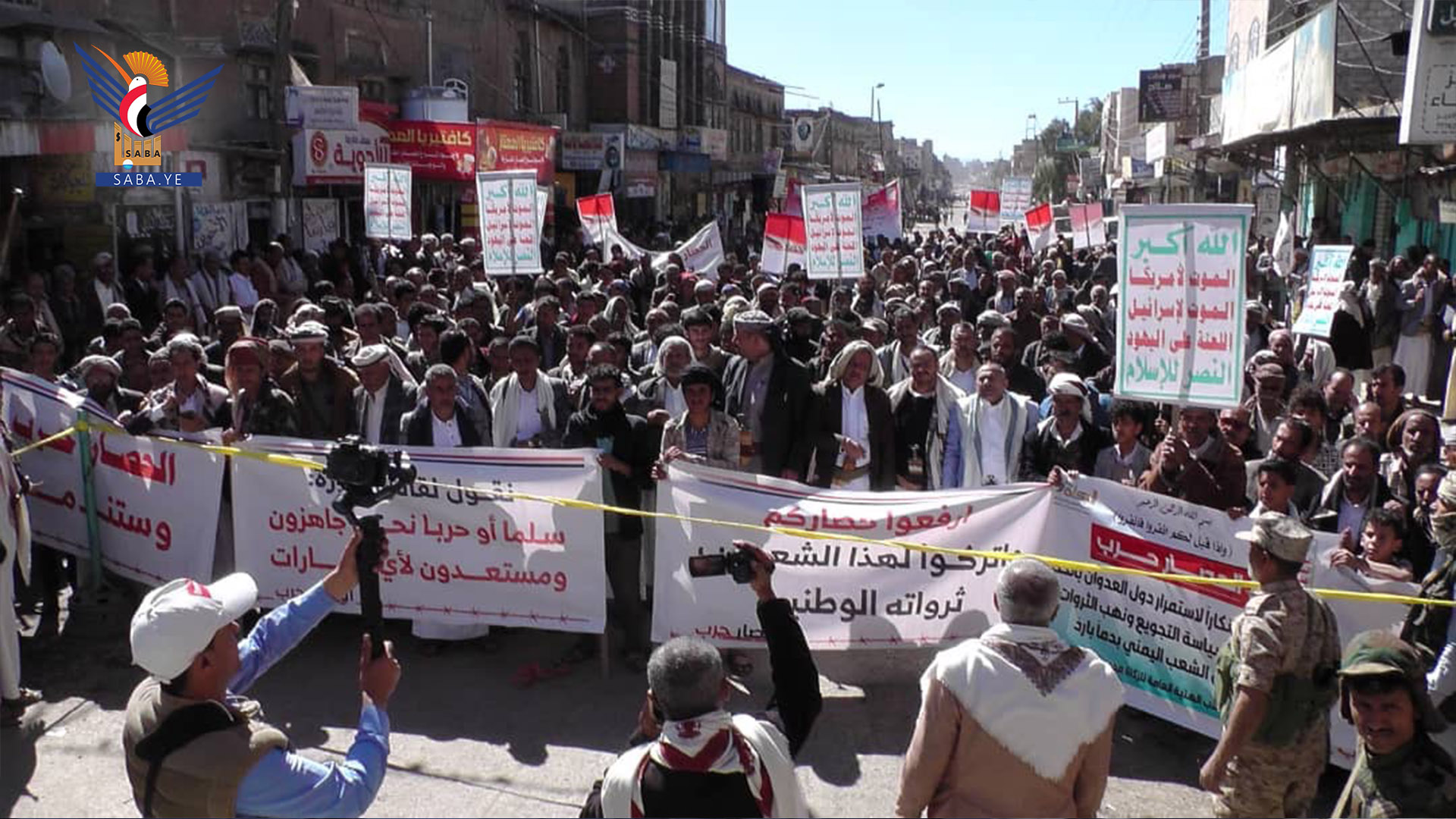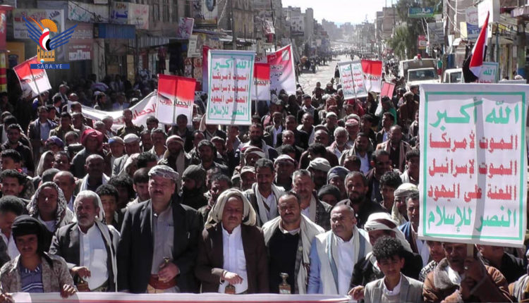 وحملت الحشود اللافتات والشعارات المنددة بإستمرار العدوان والحصار، وجرائم الحرب التي يتعرض لها الشعب اليمني منذ ثماني سنوات في ظل صمت دولي وتواطئ معيب.