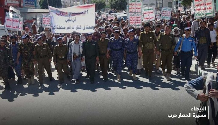 أفق نيوز | شهدت مدينة البيضاء، اليوم السبت، مسيرة جماهيرية حاشدة للتنديد باستمرار الحصار من قبل تحالف العدوان الأمريكي السعودي الإماراتي تحت شعار “الحصار حرب”.
