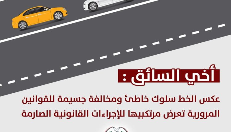 عكس الخط سلوك خاطئ ومخالفة جسيمة للقوانين المرورية، تعرض مرتكبيها للإجراءات القانونية الرادعة..